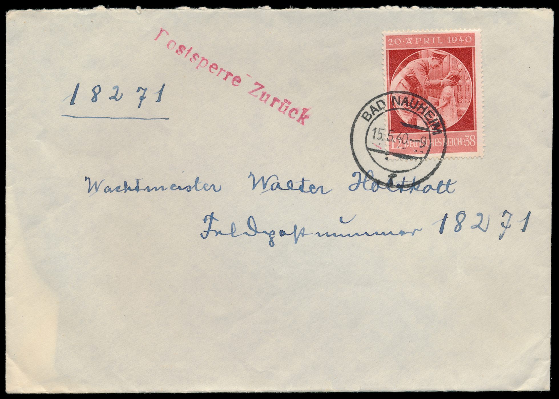 Brief mit Sondermarken-Frankatur 12 + 38 Pf., Stempel Bad Nauheim 15.5.40, an FPNr. 18271 = 1. Kompanie Infanterie-Divisions-Nachrichten-Abteilung 211, roter L1 Postsperre Zurück wegen des Westfeldzuges / Überfall auf Belgien