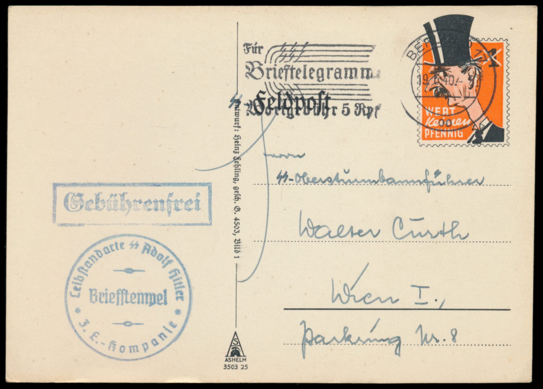 Chamberlain-Spottkarte (Druckvermerk Ashelm 3503 25) mit Maschinenstempel Berlin O 17 19.6.40 nach Wien, Briefstempel Leibstandarte SS Adolf Hitler 3. E.-Kompanie, Bedarf