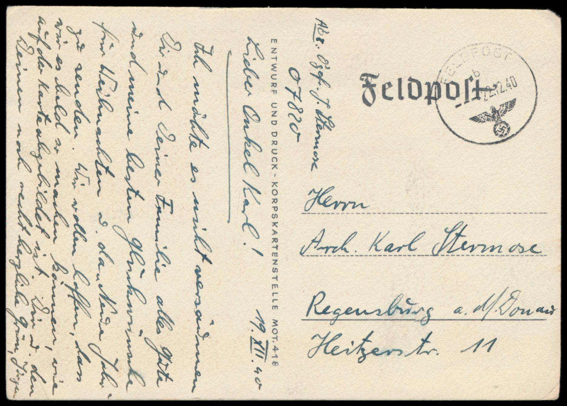 Feldpost-Bildkarte "1941 Sieg Heil", Entwurf u. Druck Korpskartenstelle Mot. 418, FPSt 22.12.40, Absender FPNr. 07820 = Regimentsstab Gebirgsjäger-Regiment 98, nach Regensburg, Bedarf