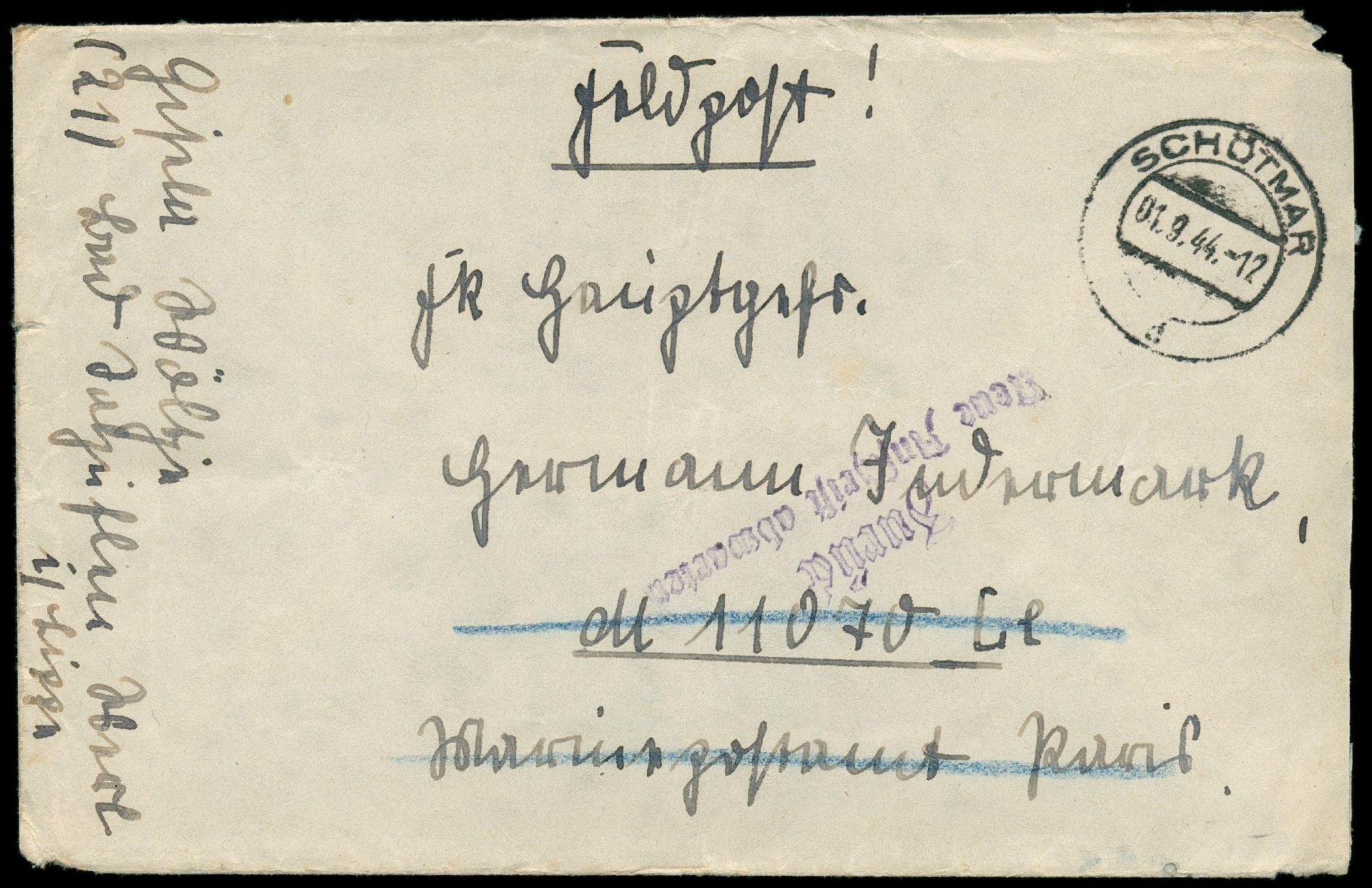 Feldpostbrief mit Stempel Schötmar 1.9.1944 an FPNr. M 11070 = Hafenkommandant St Malo, viol. Z2 Zurück / Neue Anschrift abwarten, wegen der alliierten Invasion in der Bretagne nicht zustellbar, Kapitulation der Festung St. Malo am 17.8.44, Empfänger war inzwischen auf die Kanalinsel Jersey übergewechselt, mit Inhalt