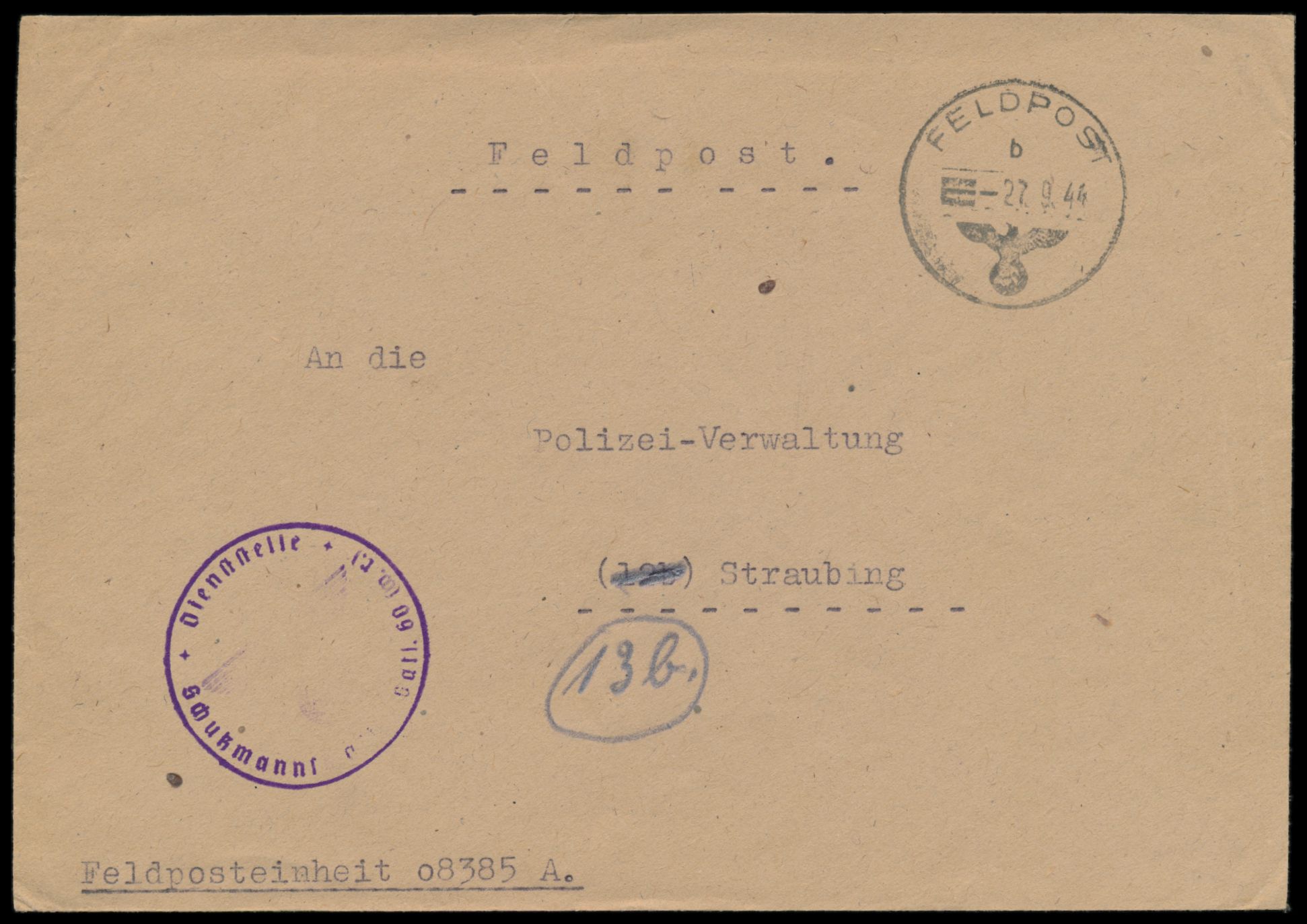 30. Waffen-Grenadier-Division der SS (2. Russische) aufgestellt im August 1944 im Raum Warschau aus weißrussischen, russischen und ukrainischen Soldaten von 6 Schutzmannschaft-Bataillonen (Schutzmannschaft-Brigade Siegling), im September 1944 nach Belfort / Frankreich verlegt: Brief mit FPSt 27.9.44 nach Straubing. Briefstempel Dienststelle Schutzmannschaft-Batl. 60 (w.r.) und Feldpostnummer 08385 = Stab Schutzmannschaft-Bataillon 60