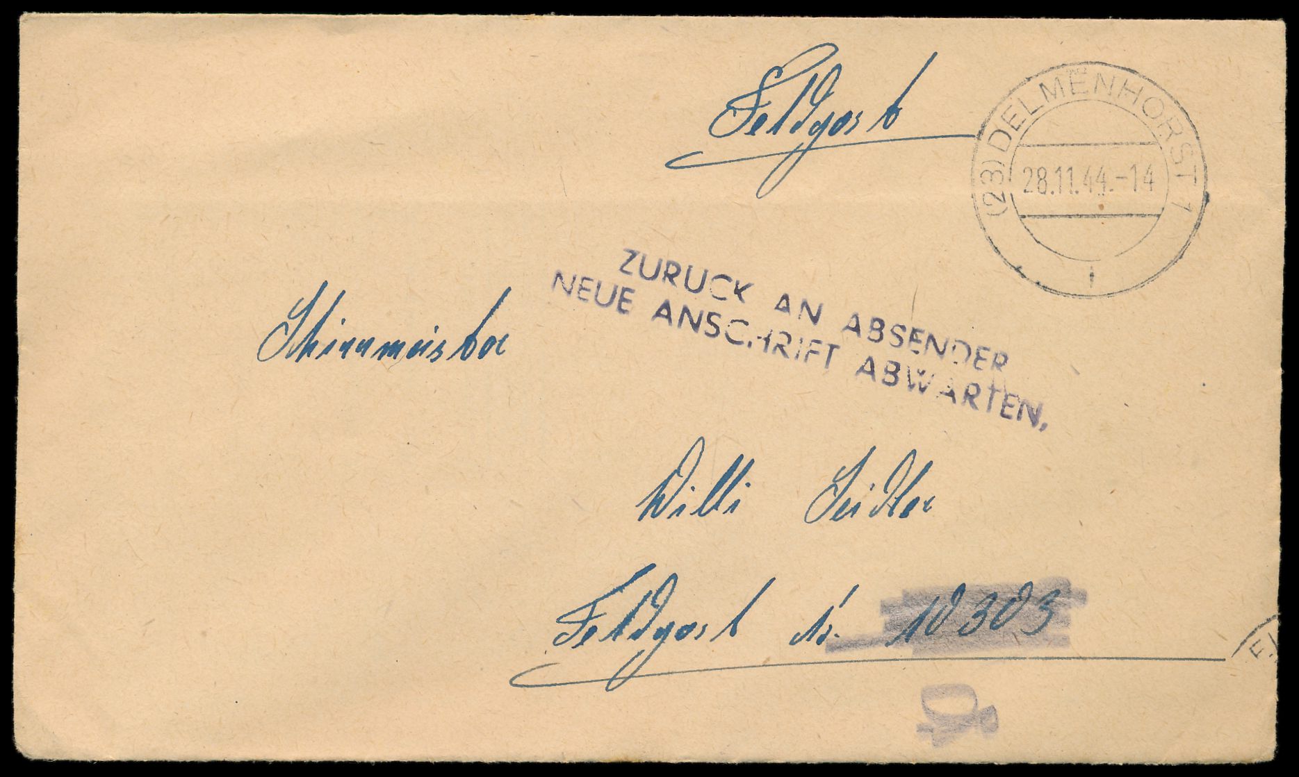 Brief mit Stempel (23) Delmenhorst 1 28.11.44 an FPNr. 10303 = Stab Sturm-Brigade Rhodos, vermutlich wegen Evakuierung auf das Festland violetter L2 Zurück an Absender / Neue Anschrift abwarten, noch ungeöffnet mit Inhalt