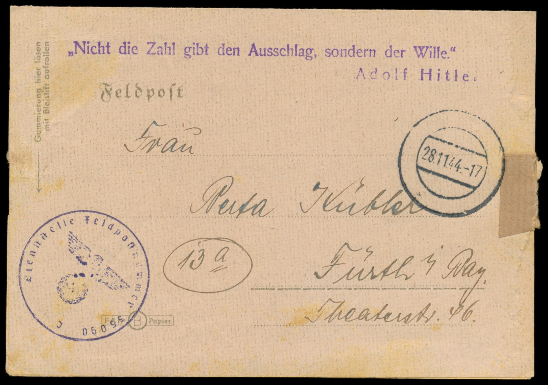 Feldpost-Faltbrief mit stummem Stempel 28.11.44 nach Fürth, handschriftlicher Absender und Briefstempel FPNr. 35090 C = 2. Kompanie Bau-Pionier-Ausbildungs-Bataillon 13, zwei Propagandastempel, vorderseitig "Nicht die Zahl gibt den Ausschlag, sondern der Wille. Adolf Hitler" und rückseitig "Wer leben will, der kämpfe also... Adolf Hitler", etwas fleckig