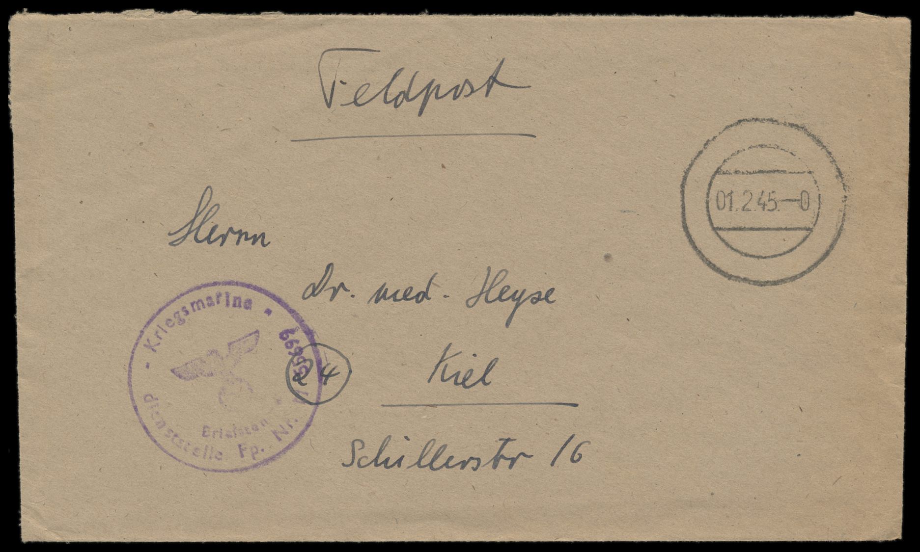 Feldpostbrief mit stummem Stempel 1.2.45 (von Triest) nach Kiel, Briefstempel und handschriftlicher Absender ... FPNr. M 55699 = Lazarettschiff Gradisca, unmittelbar nach Ankunft in Triest am 29.1.1945. Das Schiff hatte zuvor Leros am 20.1.1945 verlassen und wurde von einem britischen Zerstörer angehalten, der es nach Alexandria geleitete. Erst nach Inspektion und Gefangennahme eines Teiles der Verwundeten konnte die Fahrt fortsetzt werden.