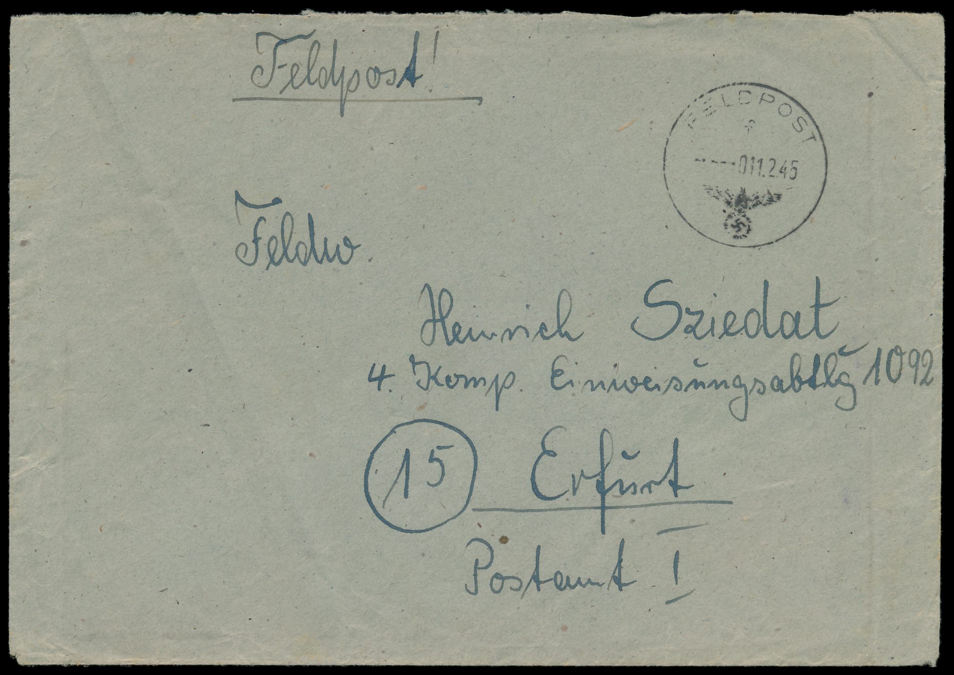 Ostpreußen-Kessel, Brief mit FPSt UB f 11.2.45 nach Erfurt, handschriftlicher Absender ... FPNr. 20511 = 2. Sanitäts-Kompanie 1 der 1. Infanterie-Division, in der Festung Königsberg, links schwacher Bug