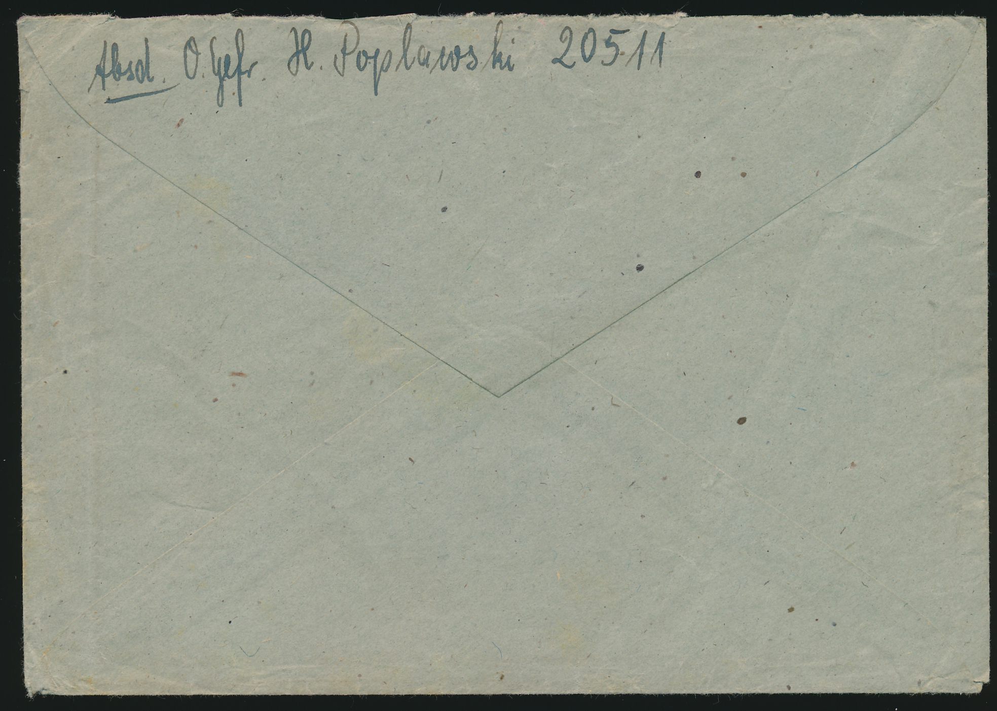 Westpreußen-Kessel: Brief mit FPSt 2.3.45 nach Leipzig, vorderseitig handschriftlicher Absender ... FPNr. 18896 D = Kommandant des Brückenkopfes Marienwerder, undeutlicher Briefstempel, auf dem Seeweg aus Westpreußen herausbefördert, handschriftlicher Ankunftsvermerk 22.3.1945