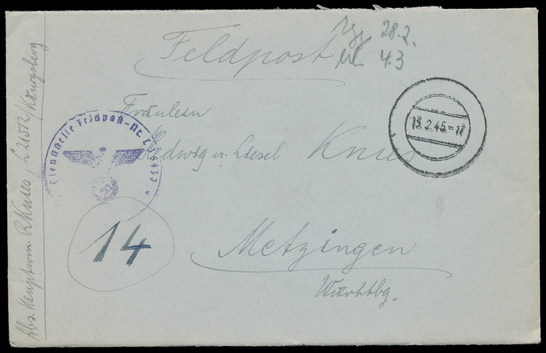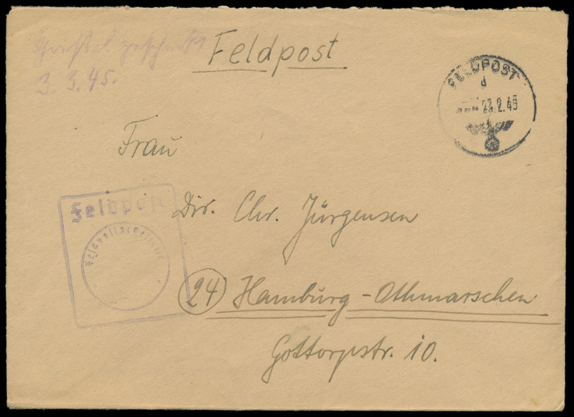 Ostpreußen-Kessel, Brief mit FPSt 23.2.45 nach Hamburg, handschriftlicher Absender ... FPNr. M 63106 F = Kommandant d. Seeverteidigung Ostpreussen (Festung Pillau) , seltener Briefstempel Feldpostprüfstelle