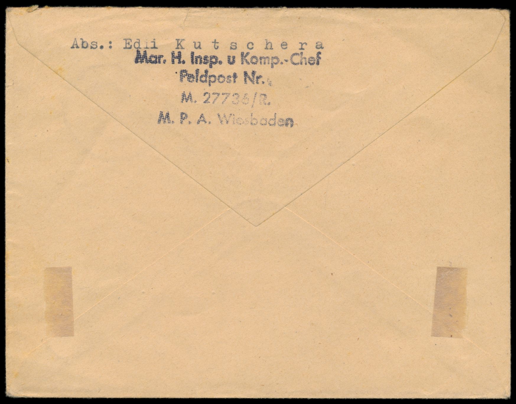 Atlantikfestung La Rochelle, Feldpostbrief mit Briefmarkenimitation mit Bild des "Tour del la Lanterne" von La Rochelle, Briefstempel Kriegsmarine / Dienststelle Feldpostnummer M 27736 = 4. Marine-Sicherungs-Division, rückseitig Absenderstempel "Mar. H. Insp. u. Komp.-Chef / Feldpost Nr. / M 27736 / R. / M.P.A. Wiesbaden", Tarnstempel 2.III.45, nach Wilhelmshaven