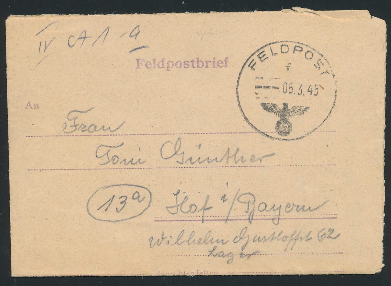 FPSt mit UB f 5.3.45 auf Feldpostfaltbrief nach Hof, Absender ... FPNr. 10815 = Pferde-Lazarett 542, geschrieben in Ungarn, spätes Datum