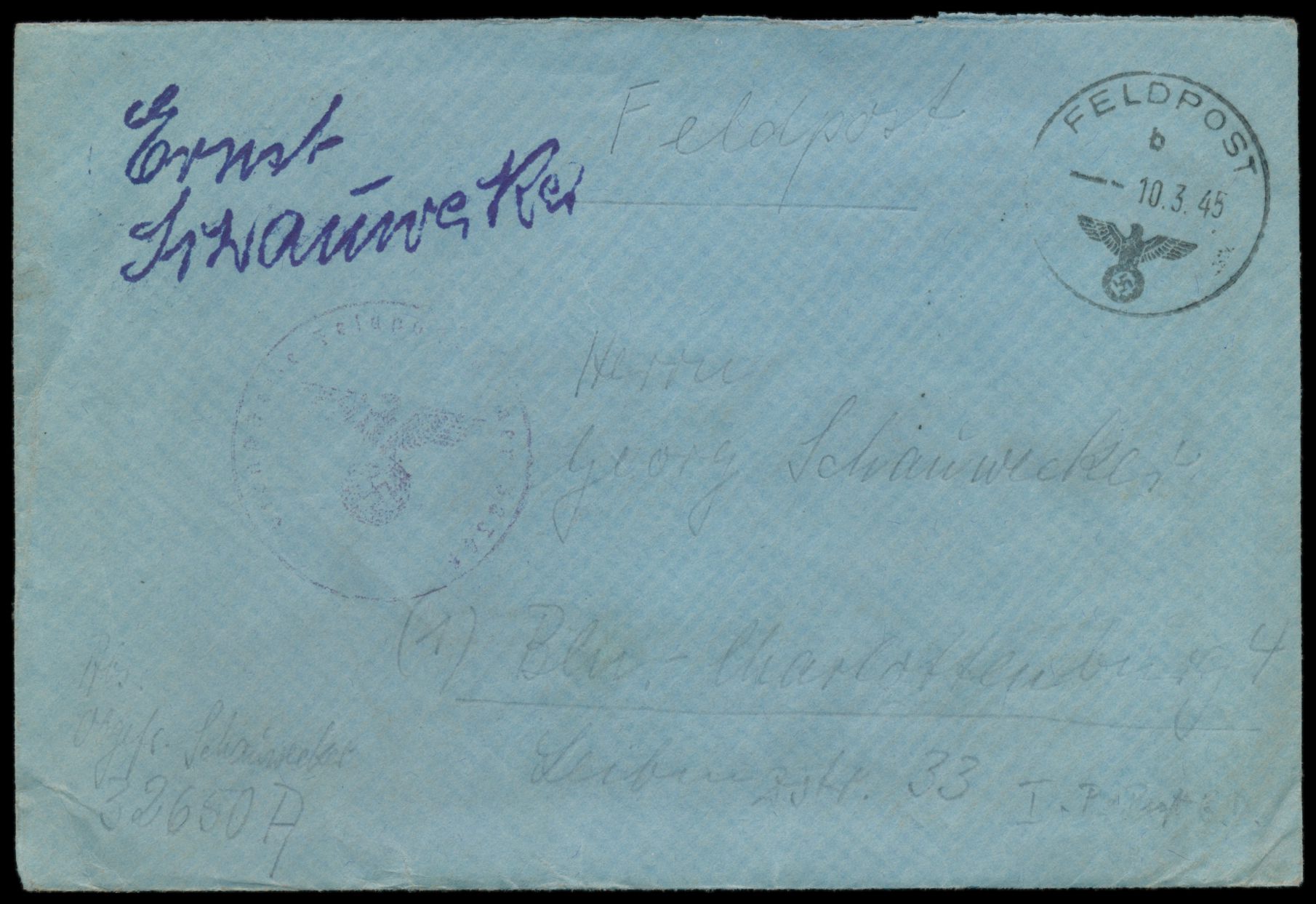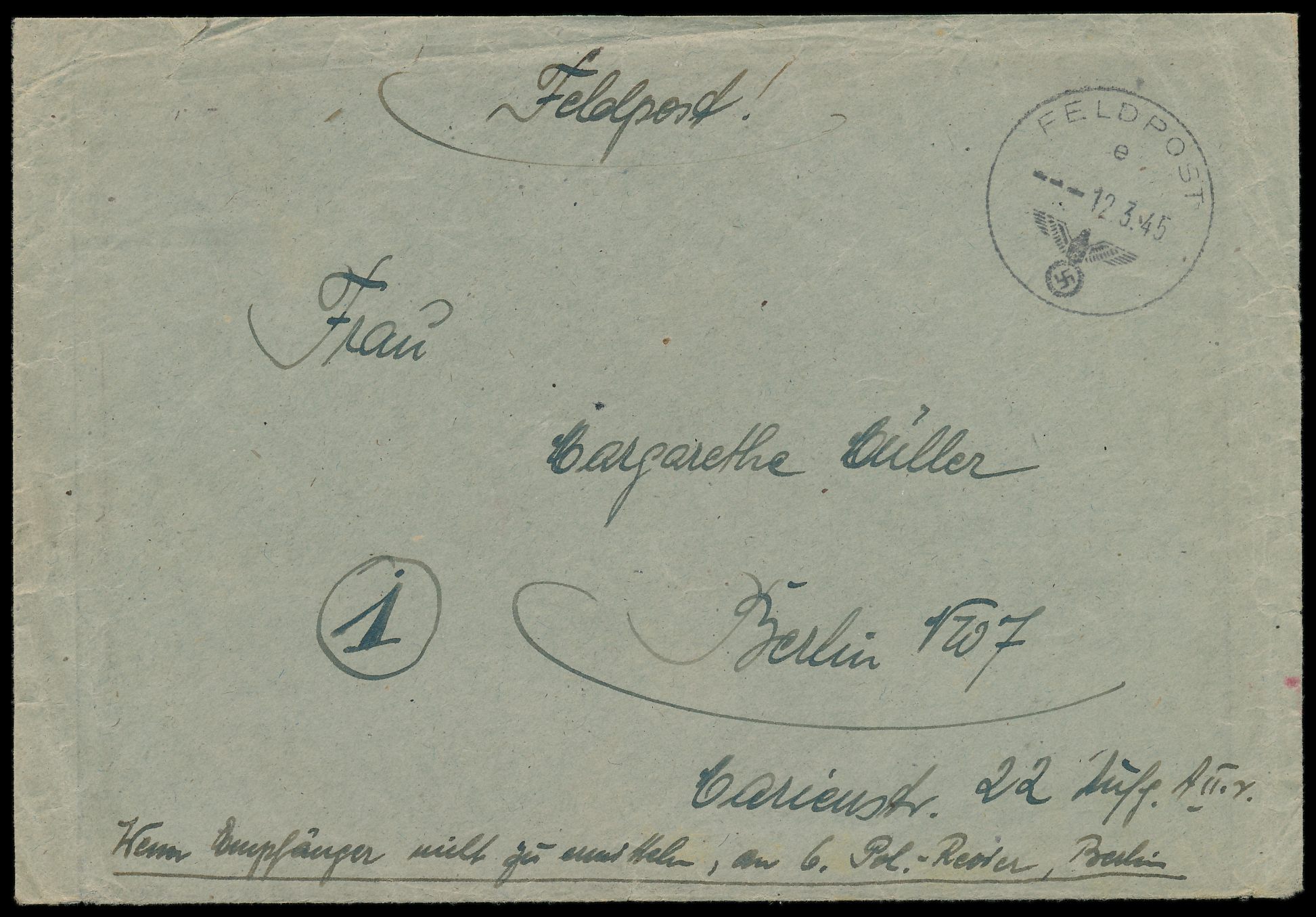 Ostpreußen-Kessel, Brief mit FPSt UB e 12.3.45 nach Berlin, handschriftlicher Absender ... FPNr. 16435 A = Regimentsstab Grenadier-Regiment 1141 der 561. Volks-Grenadier-Division in der Festung Königsberg, mit vierseitigem Briefinhalt, Umschlag leichte Beförderungsspuren