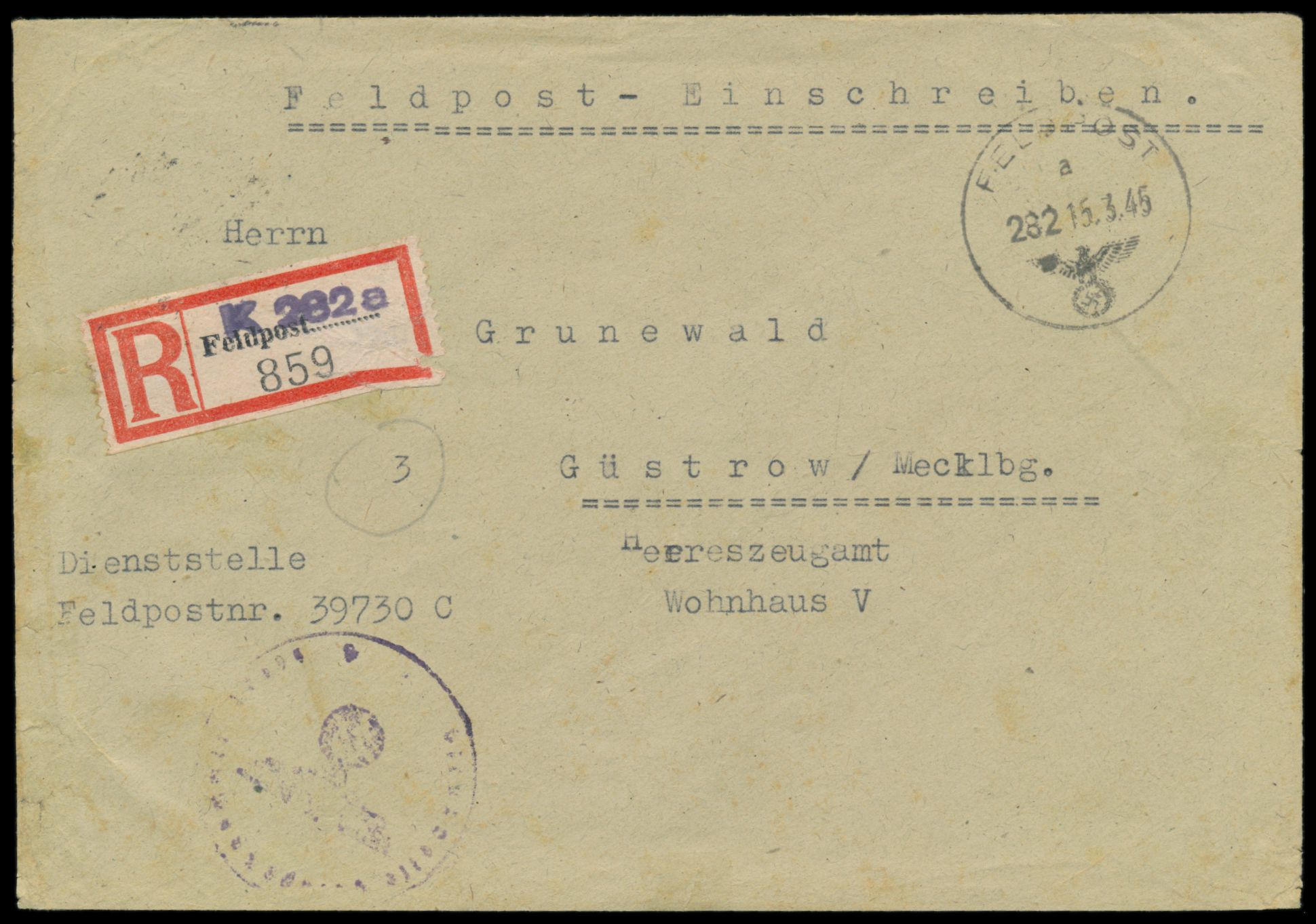 Einschreibbrief mit FPSt mit Kenn-Nr. 282 15.3.45 und entsprechendem R-Zettel, FPA1548, im Ostpreußen-Kessel, Absender Dienststelle FPNr. 39730 C = 13. Kompanie Grenadier-Regiment 1096 in der Festung Königsberg, nach Güstrow, Ankunftstempel 23.4.45, Umschlag mit schwachen Alterungsspuren