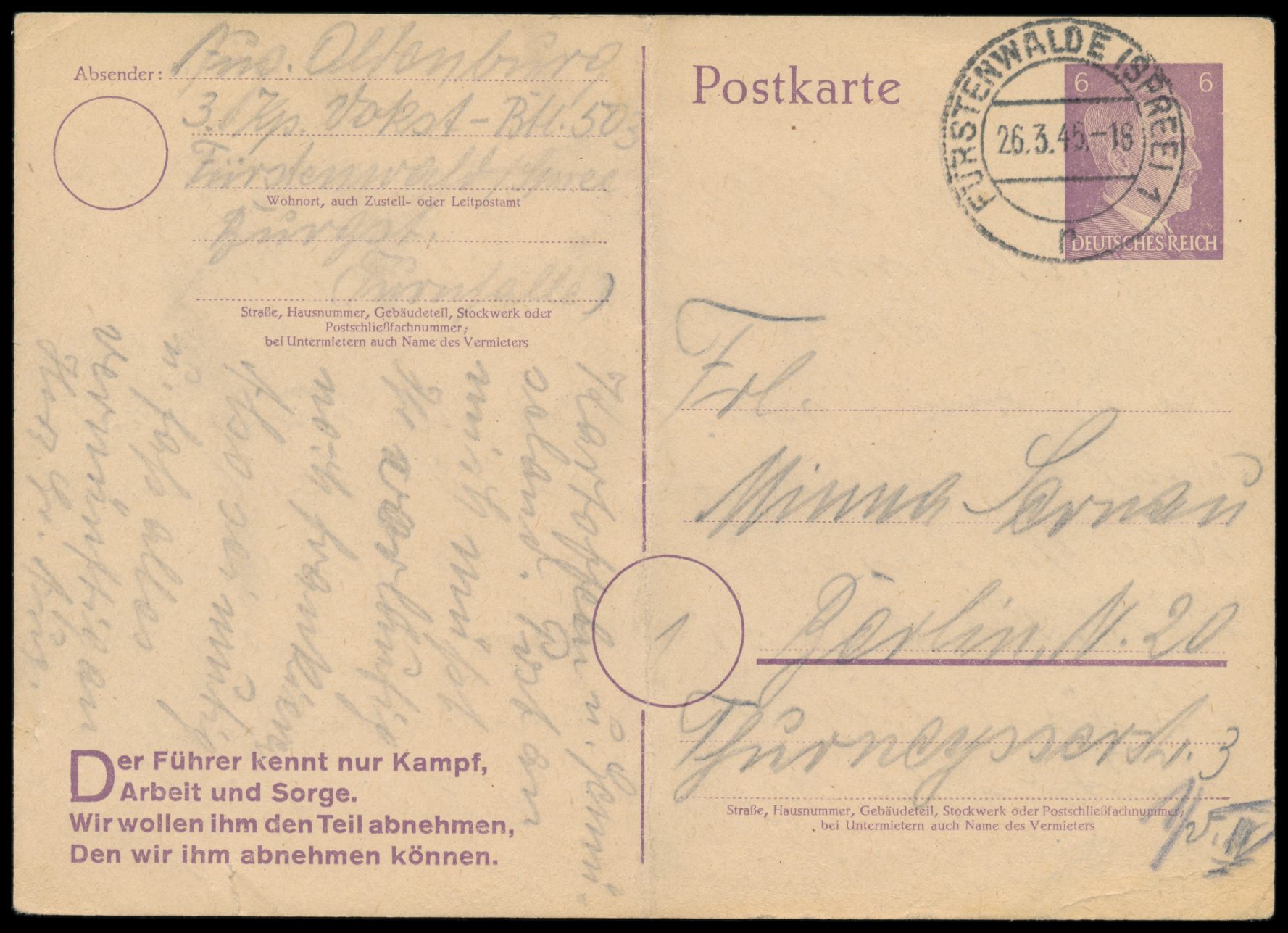 Ganzsache 6 Pf. mit Stempel Fürstenwalde (Spree) 1 26.3.45 nach Berlin, handschriftlicher Absender ...3. Kp. Volkst.-Btl. 503 ... , senkrechter Mittelbug, Bedarf