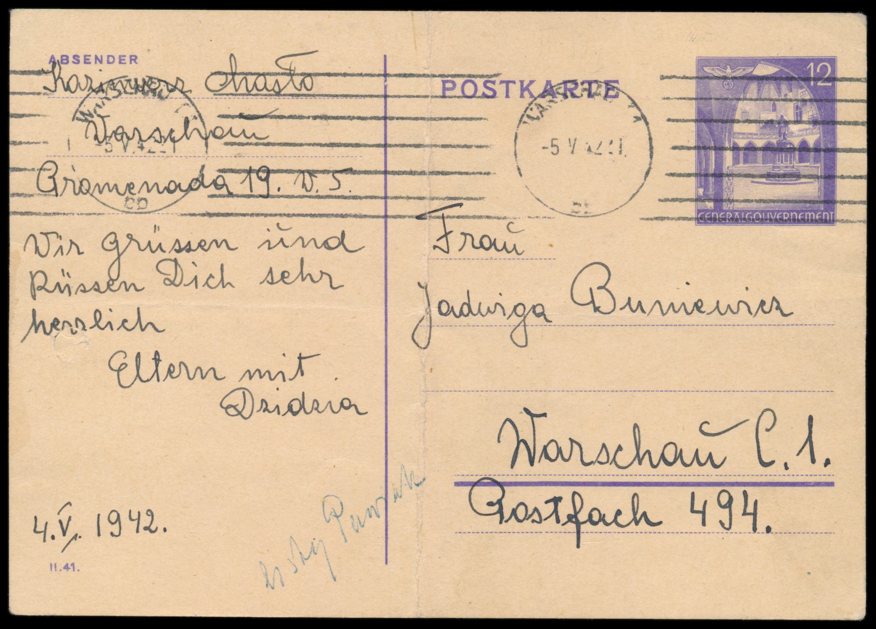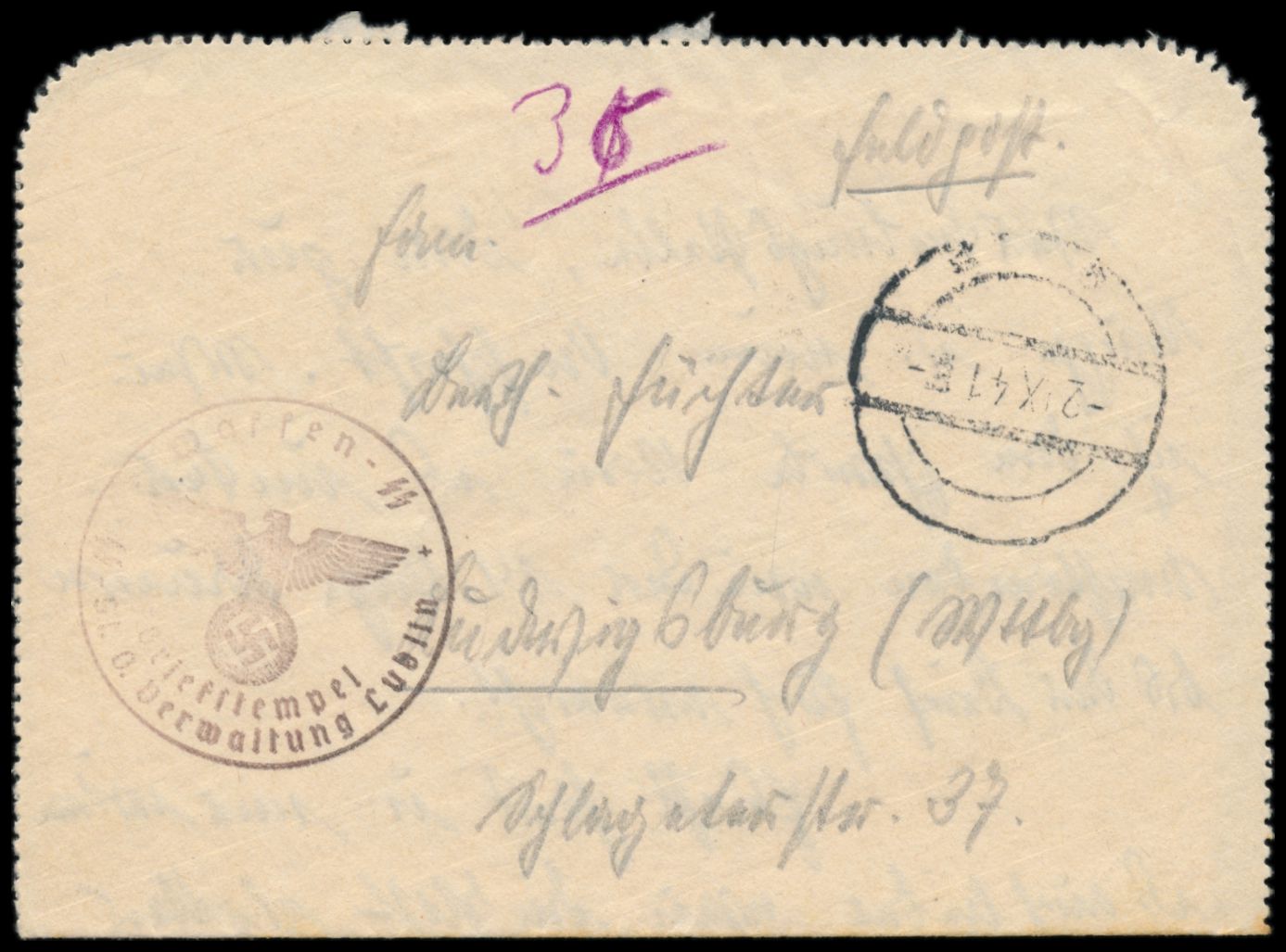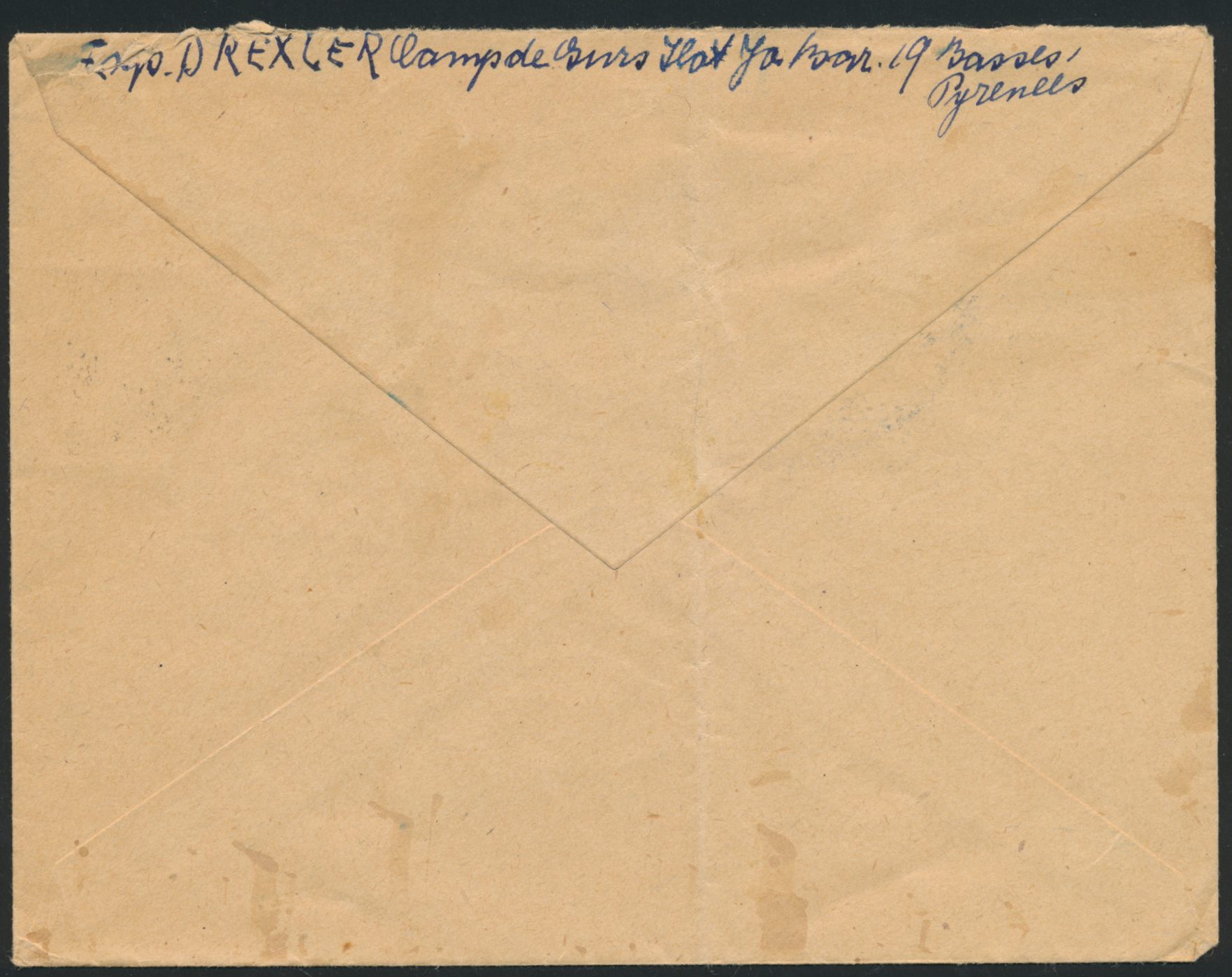 Frankreich- Frankatur 4 F auf Brief aus Camp de Gurs, Stempel Camp de Gurs 20.1.42, Lager- Zensurstempel No.3 . Schreiberin ist Dr. Margarethe Drexler aus Landau, die während der Bürckel-Aktion am 22.10.40 nach Gurs deportiert wurde. Es gelang ihr für kurze Zeit nach Grenoble zu gelangen, wo sie bei einer Razzia gefasst und 1942 über Drancy nach Auschwitz deportiert wurde. Der Brief ist gerichtet an ihre Schwester in Bern