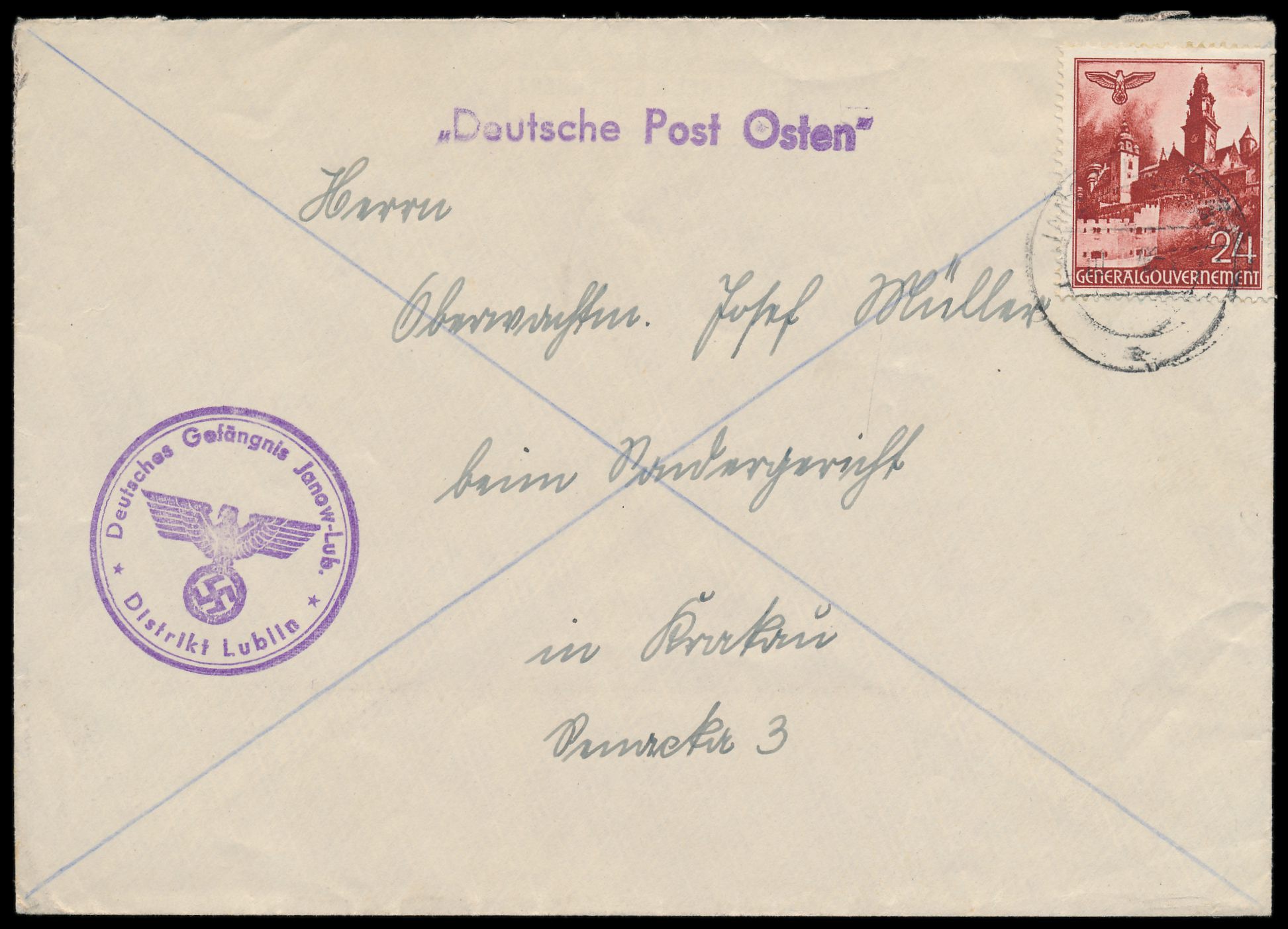 24 Gr. Generalgouvernement auf Brief mit Absenderstempel Deutsches Gefängnis Janow-Lub. (= Lubelski), Absender ist ein Oberwachtmeister, an das Sondergericht in Krakau