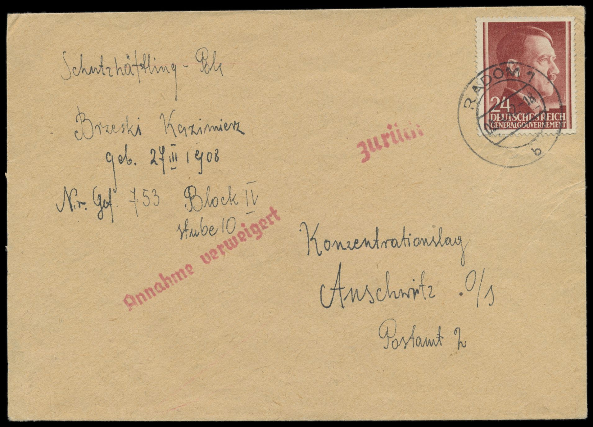 Generalgouvernement 24 Gr. auf Brief Radom 2.1.42 in das KZ. Auschwitz, rote Stempel zurück, Annahme verweigert und Rückseite zurück schon Post erhalten, beanstandete Post ist selten