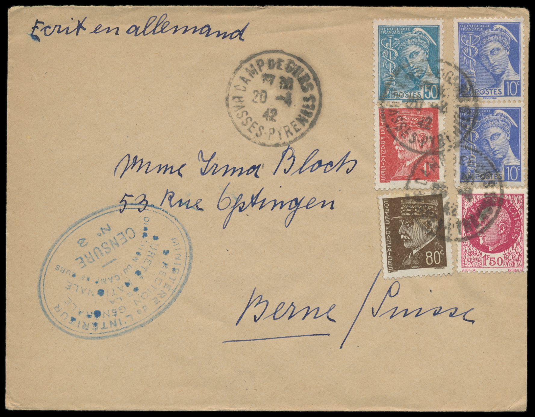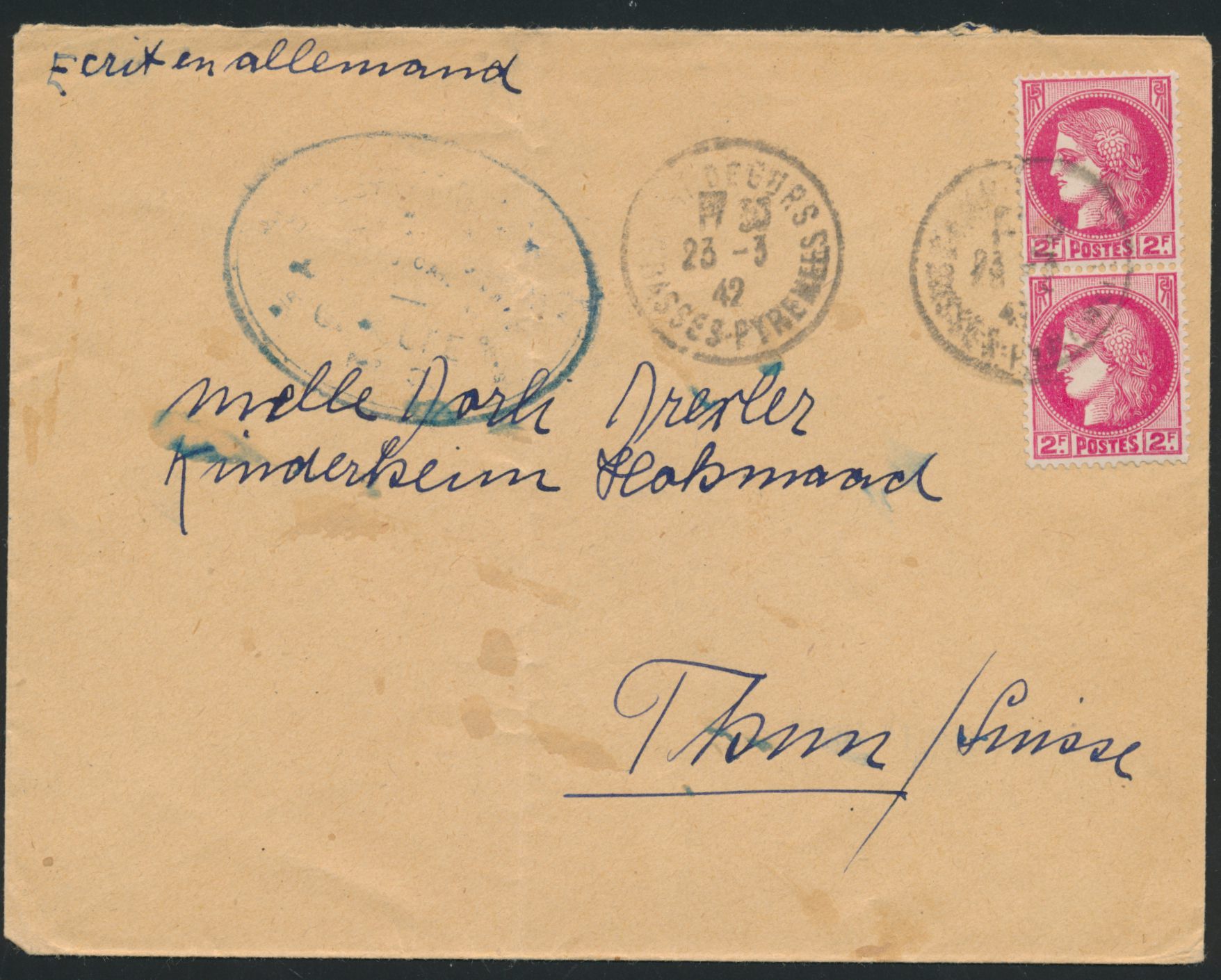 Frankreich 2x 2 F. auf Brief nach Thun in der Schweiz, Stempel Gurs 23.3.42, Absender ist die Mannheimer Krankenschwester Margarete Drexler, am 22.10.40 nach Gurs deportiert, in Grenoble verhaftet, am 2.9.42 nach Drancy und von dort nach Auschwitz verbracht. Empfänger ist die Tochter Dorothea, schwacher Zensurstempel der Sureté No. 3, schwacher Mittelbug