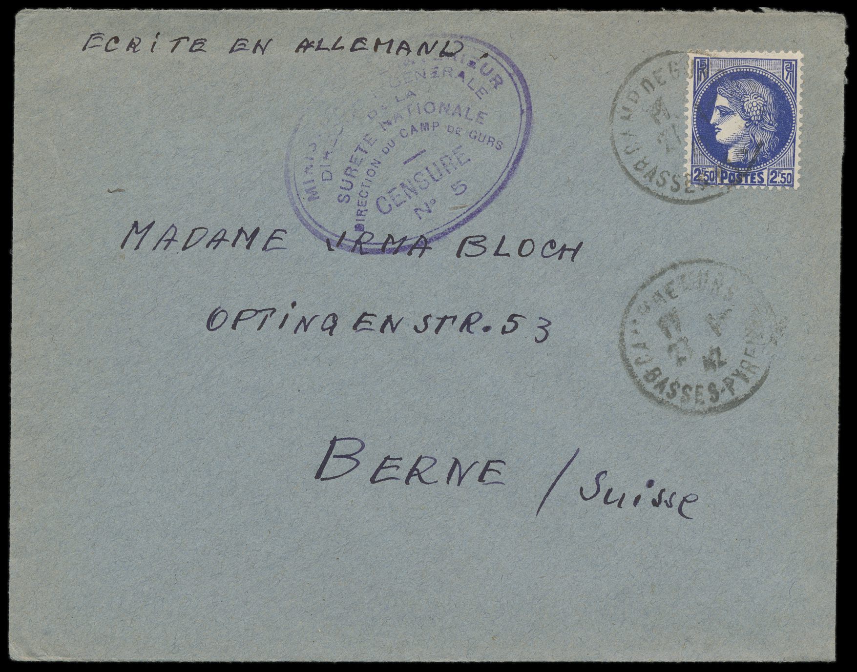 Frankreich- Frankatur 2,50 F auf Brief aus Camp de Gurs nach Bern, Stempel Camp de Gurs 27.1.42, Lager- Zensurstempel No. 5 . Schreiberin ist Luise Koch aus Bad Dürkheim, die während der Bürckel-Aktion am 22.10.40 nach Gurs deportiert. Über das Lager Drancy wurde sie am 12.8.42 nach Auschwitz verbracht.