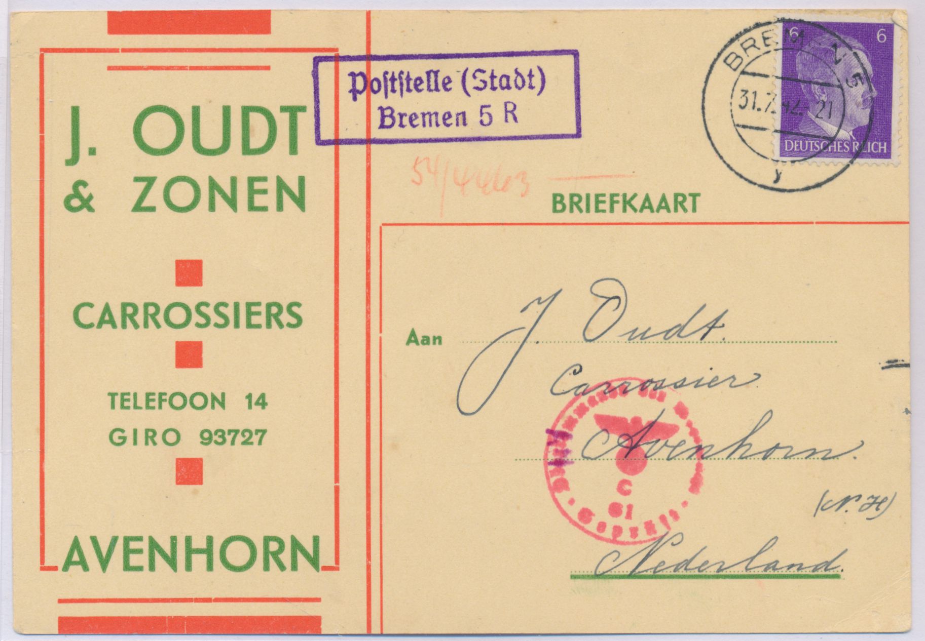 Niederländische Firmenkarte mit 6 Pf. Hitler nach Holland, violetter R2 Poststelle (Stadt) Bremen 5 R und Stempel Bremen 5 31.7.42, Europatarif, portorichtig, Absender ist Niederländer im Zwangsarbeiter-Lager "Tirpitz" (Schiffswerft AG Weser in Bremen-Gröpelingen), OKW-Zensur Köln, langer Bedarfstext in niederländischer Sprache