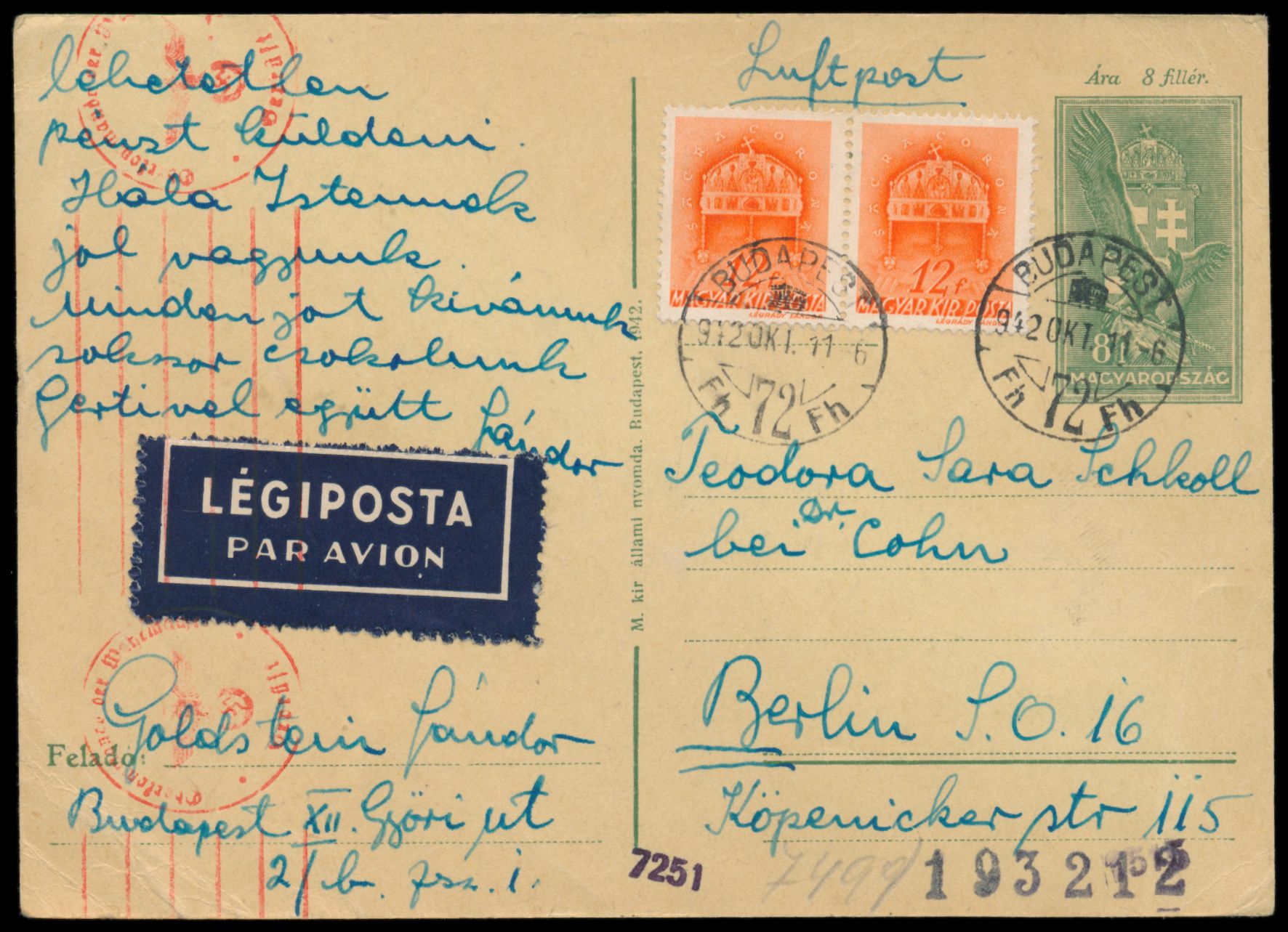 Ungarn-Ganzsache 8 f mit 2 x 12 f als Luftpostkarte von Budapest 11.10.1942 mit OKW-Zensur Wien nach Berlin, Empfängerin ist Teodora Schkoll (mit Zwangsnamen-Zusatz "Sara" ) bei Dr. Cohn in Berlin S.O. 36, Köpenicker-Straße 115, am 1. März 1943 mit dem sogenannten 31. Osttransport vom nach Auschwitz deportiert und dort ermordet. Der Absender Sandor Goldstein wurde ebenfalls umgebracht