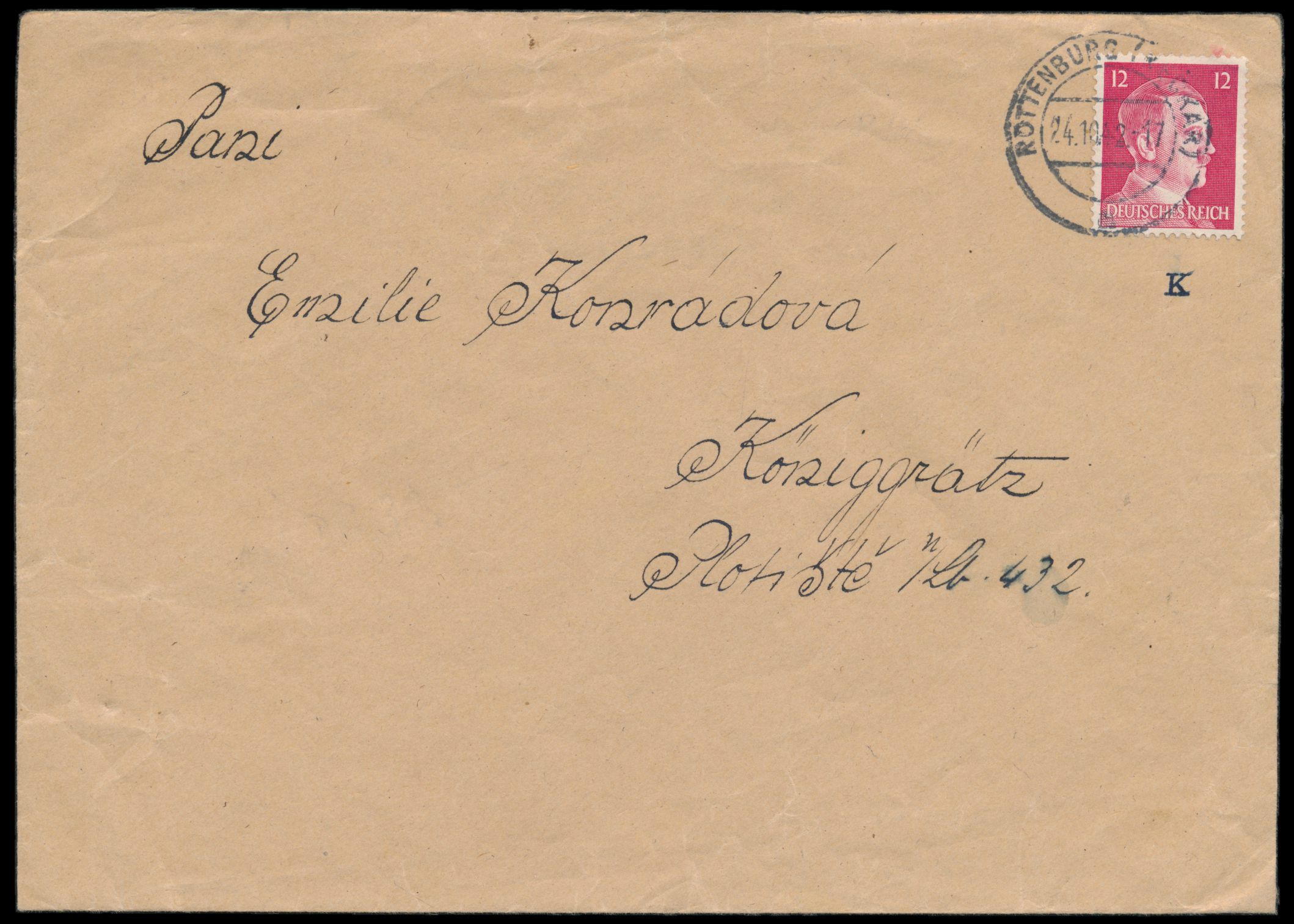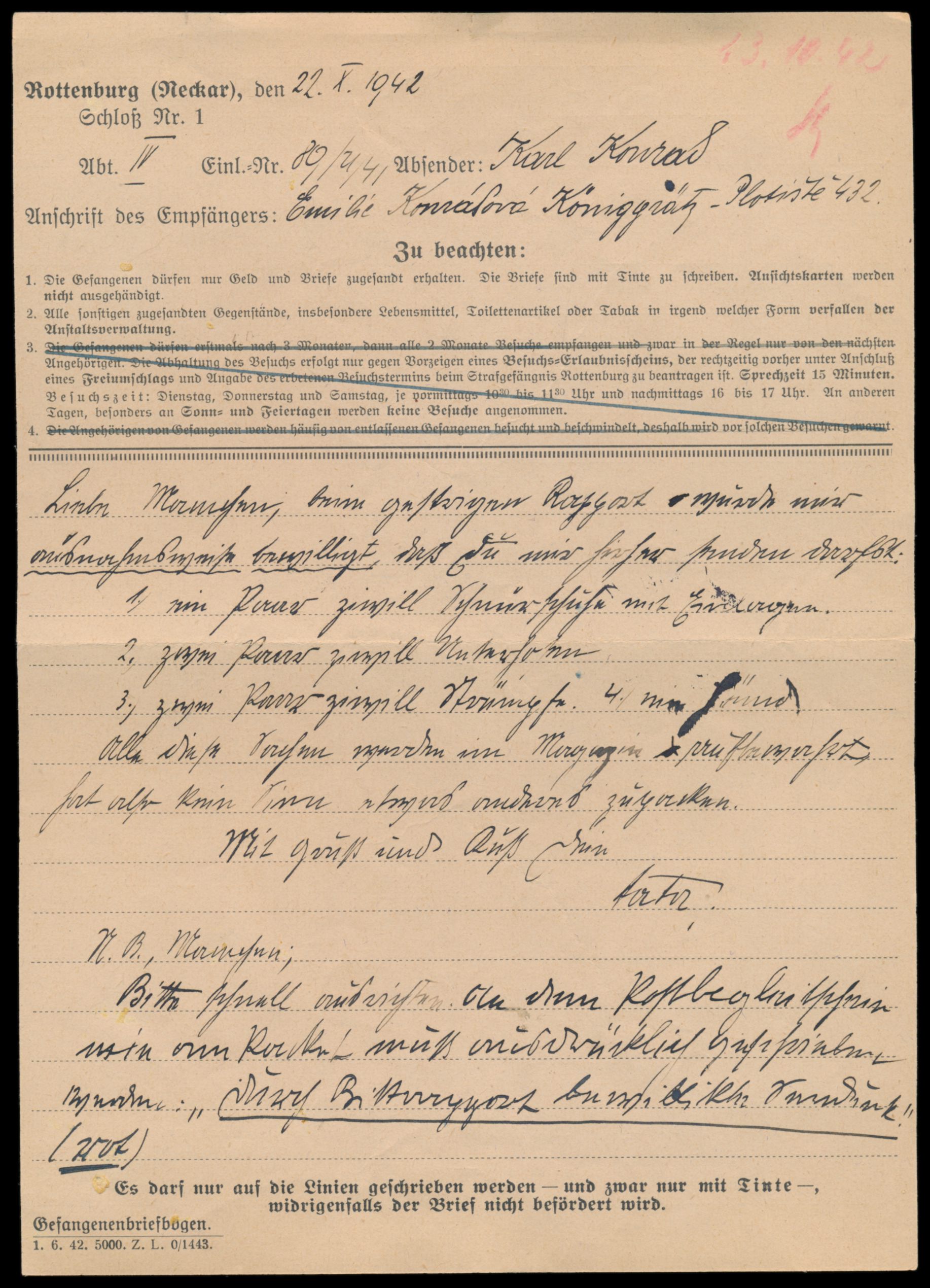Gefängnis Rottenburg (Neckar), Brief eines Tschechen mit 12 Pf. Hitler nach Königgrätz 24.10.42, mit Inhalt: Gefangenen-Briefbogen mit Druckvermerk "1. 6. 42. 5000. Z. 1. 0/1443."