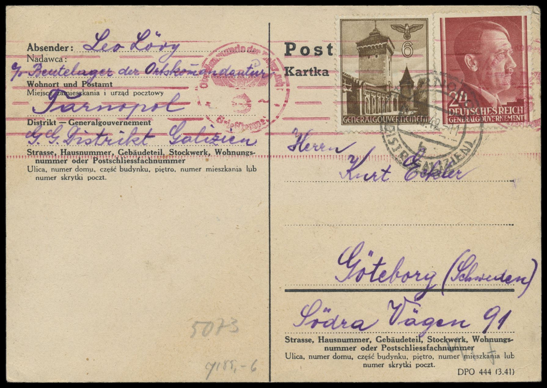 6 und 24 Gr. Generalgouvernement auf Auslandskarte mit OKW-Zensur nach Schweden. Seltener Beleg aus dem Ghetto Tarnopol . Schreiber ist der jüdische Elektriker Leo Löwy (wohnhaft in der Perlgasse, wo auch der Sitz des Judenrates war) jetzt mit Adresse Beutelager (für die Waffen-SS). Inhalt: Vater nach Theresienstadt, Stempel Tarnopol 28.10.42. Löwy entging den Liquidierungen von Anfang September, weil er dort einen Arbeitsplatz bekam. Post aus den Ghettos Ost-Galiziens ist selten wegen der späten Besetzung erst nach dem Beginn des Krieges gegen die Sowjetunion.