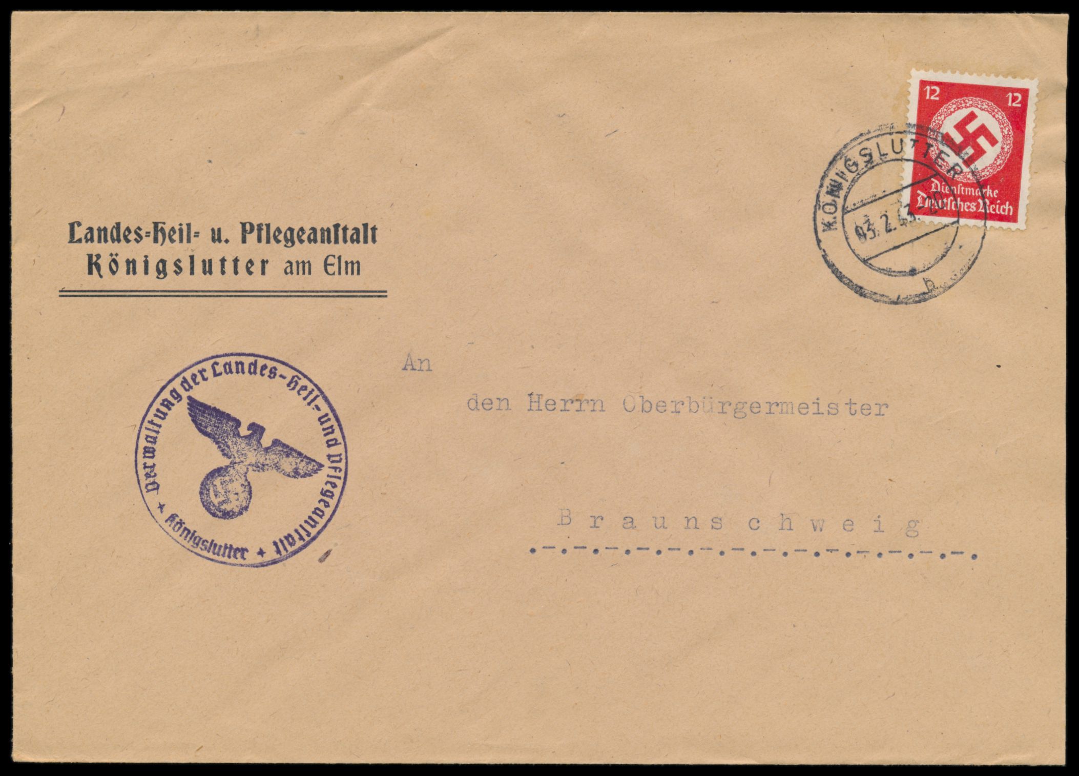 Vordruckbrief Heil- und Pflegeanstalt Königslutter mit Dienststempel, Dienstmarke 12 Pfg., Stempel Königslutter 3.2.43, Bedarf nach Braunschweig. Königslutter war Durchgangsstation in der Aktion T4