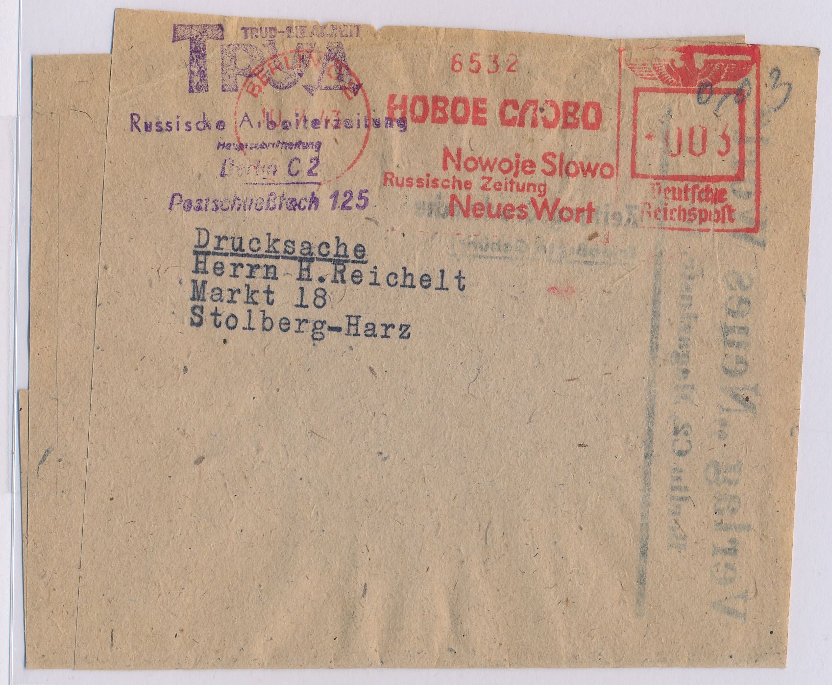 Absenderfreistempel Nowoje Slowo - Russische Zeitung Neues Wort, Berlin C 2 10.2.43, Adlerkopf-Wertrahmen 003 Pf. auf Streifband nach Stolberg, Zeitung für russische Zwangsarbeiter