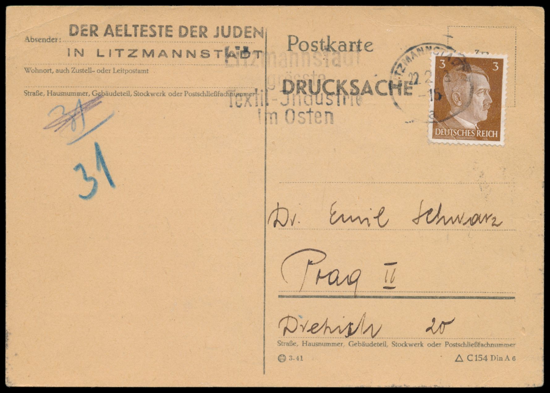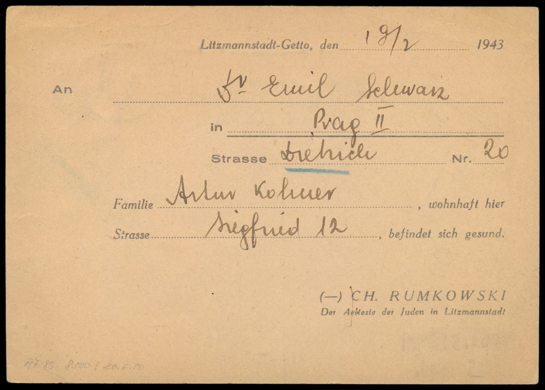 Ghetto Litzmannstadt, Vordruckkarte "Der Aelteste der Juden in Litzmannstadt" als Drucksache nach Prag, Maschinenstempel Litzmannstadt 22.2.43, Mitteilung über den Aufenthalt der Familie Artur Kohner im Ghetto, die mit Transport am 13.1.41 aus Theresienstadt nach Litzmannstadt deportiert worden war