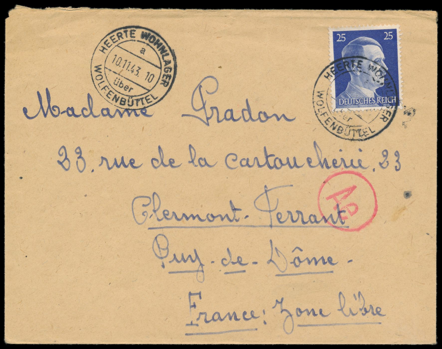 25 Pf. Hitler mit seltenem Stempel Heerte Wohnlager über Wolfenbüttel 10.11.43 auf Brief eines französischen Zwangsarbeiters nach Frankreich, Zensur-Durchlaufstempel Ae von Frankfurt
