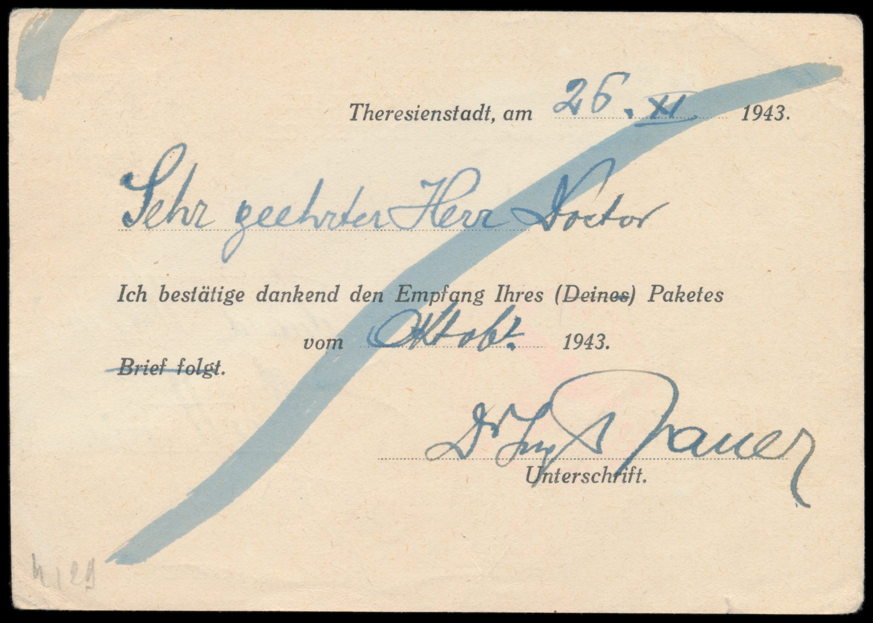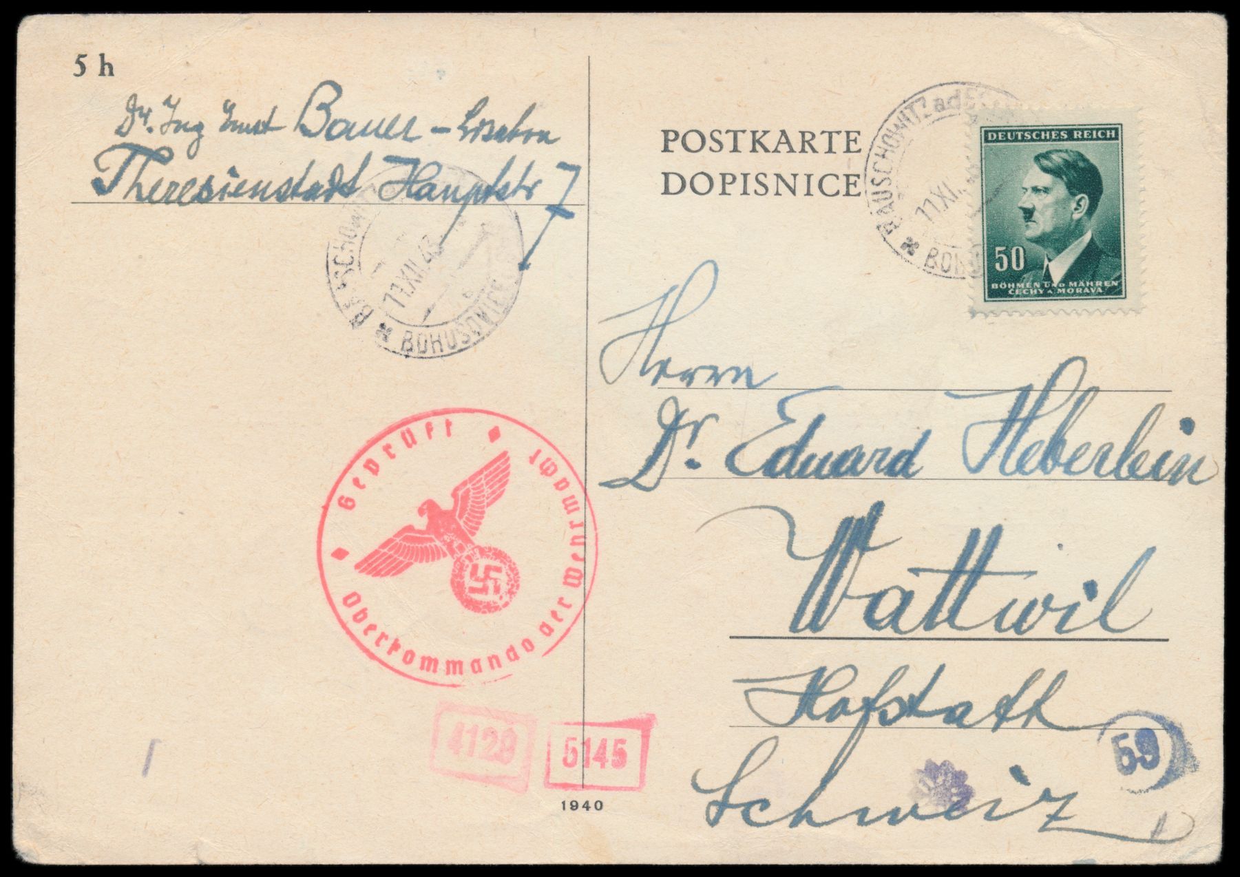 Ghetto Theresienstadt, Empfangsbestätigungskarte für ein Paket, weißer Karton, ohne Druckvermerk, Frankatur Böhmen-Mähren 50 h, Stempel Bauschowitz 11.11.43, als Drucksache in die Schweiz, roter Zensurstempel der Prüfstelle München, seltene Post ins Ausland