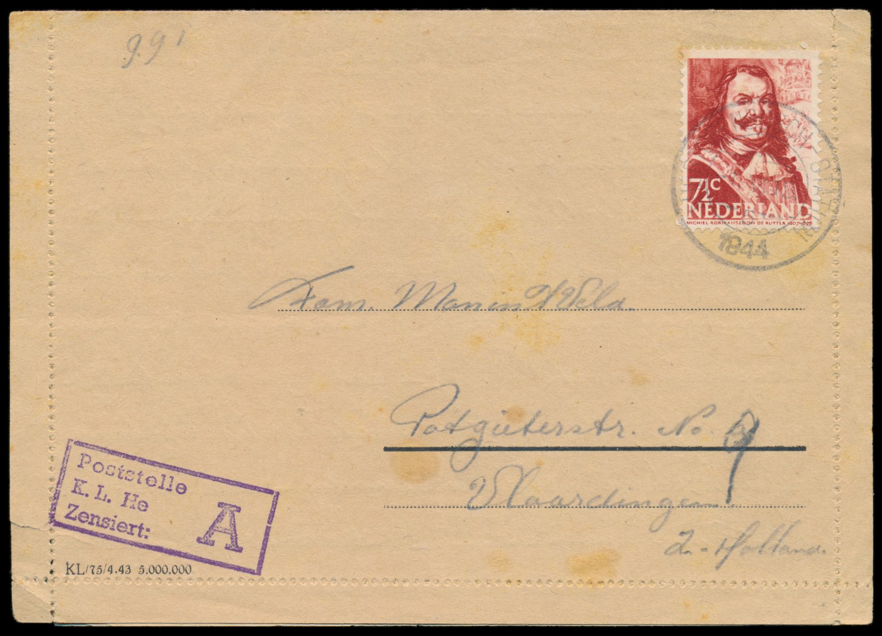 Konzentrationslager Herzogenbusch, Vordruck-Faltbrief mit Druckvermerk "KL/75/4.43 5.000.000, innen Auszug der Lagerordnung, violetter R3 "Poststelle / K. L. He / Zensiert: A", Frankatur Niederlande 7 1/2 C., Stempel s´Hertogenbosch-Station 1.5.1944, nach Vlaardingen, wenige kleine Flecken