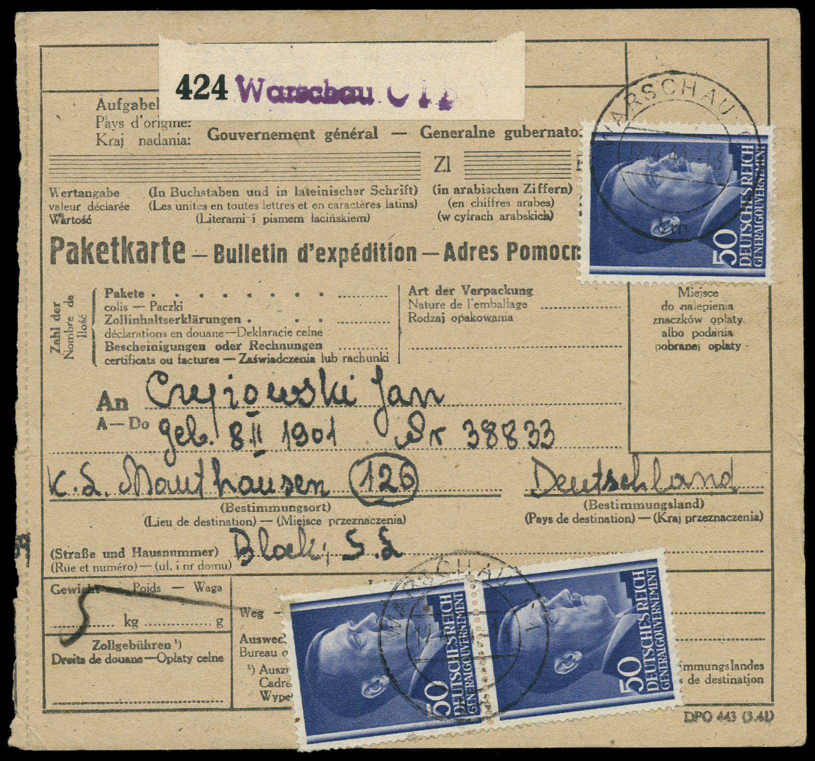 Auslands-Paketkarte aus dem Generalgouvernement mit 3x 50 Gr. Hitler, Stempel Warschau 12.4.44, Rückseite Z2 Paketzustellgebühr zurückgezahlt, in das KZ. Mauthausen