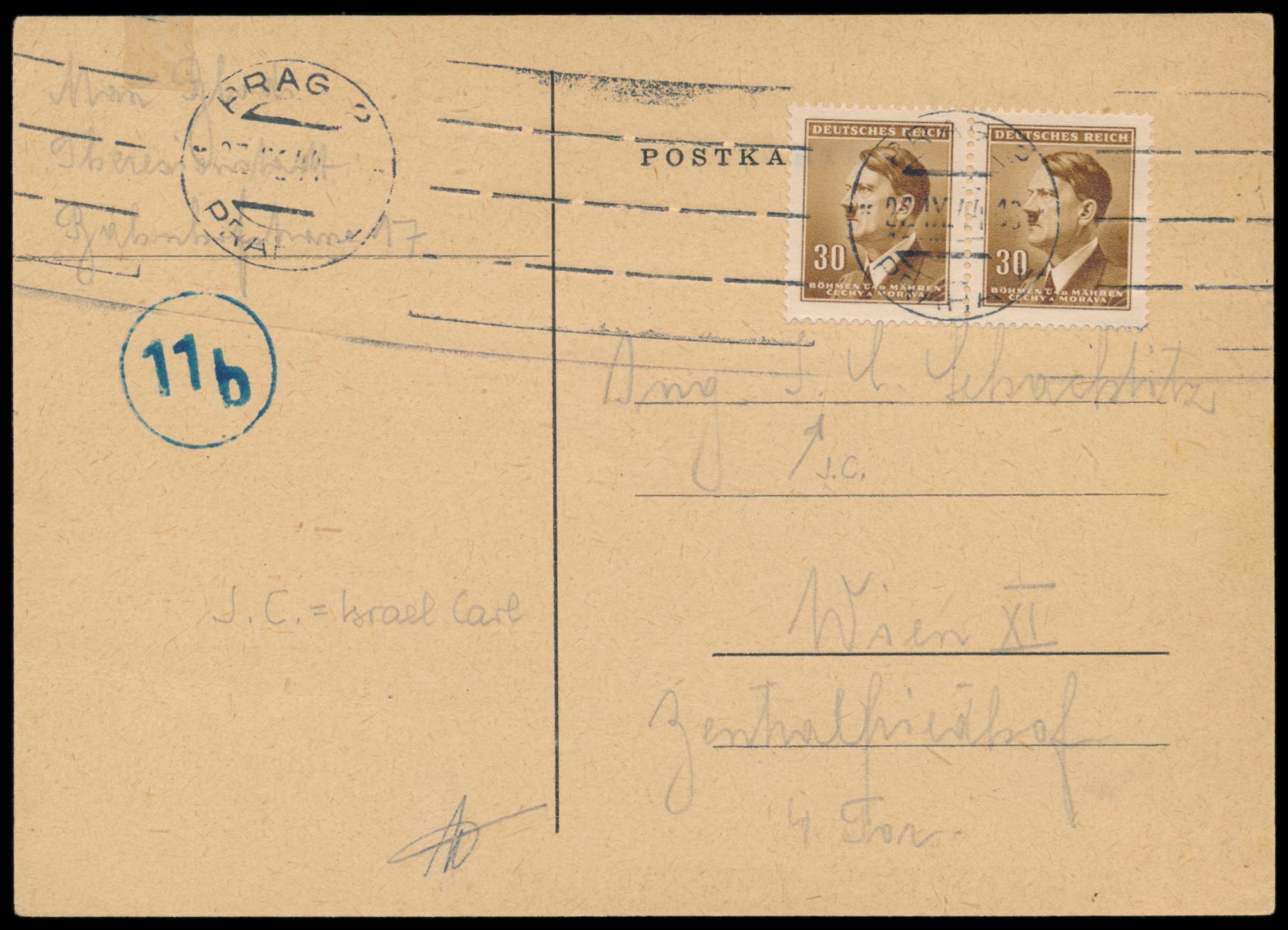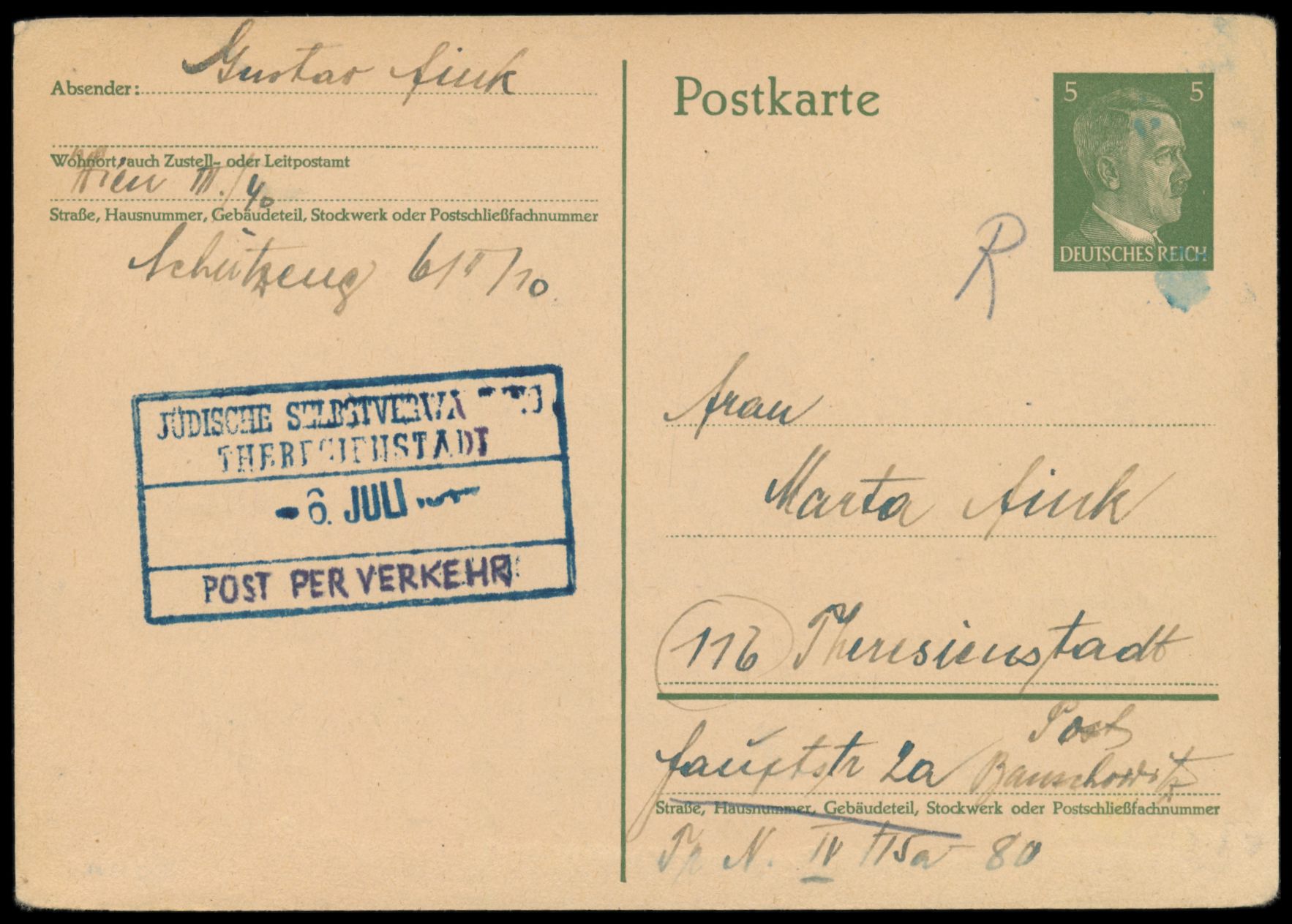 Hitler-Ganzsache aus Wien vom 13.5.1944 an Marta Fink im Ghetto Theresienstadt , wie üblich ohne Poststempel, Eingangsstempel "Jüdische Selbstverwaltung Theresienstadt 6. Juli ..." ,