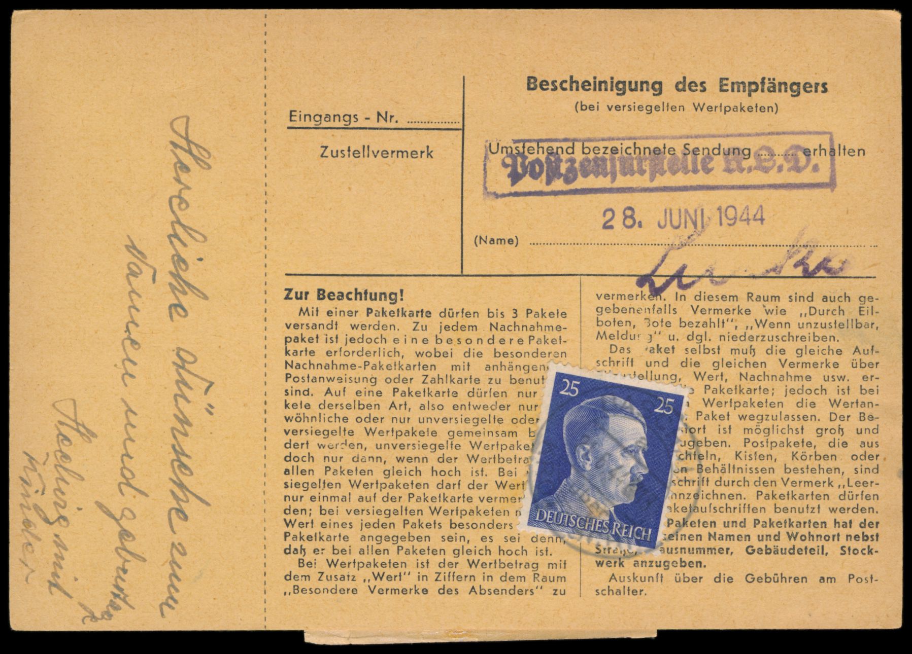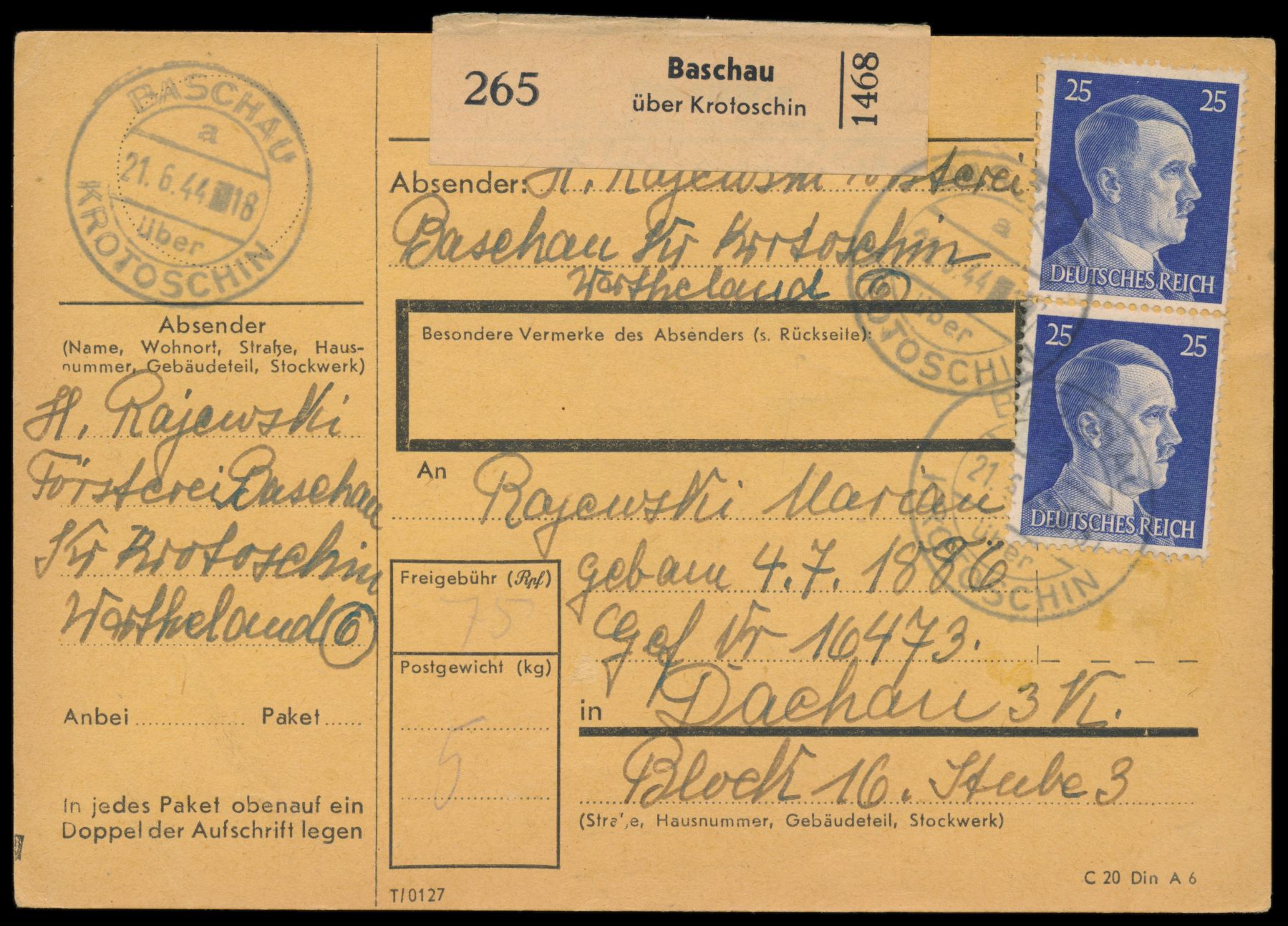 3 x 25 Pf. auf Paketkarte aus Baschin über Krotoschin 21.6.44 für ein Paket an einen Häftling im Konzentrationslager Dachau, rückseitig R1 Postzensurstelle K.L.D. und datum-Stempel 28. Juni 1944 und gestempelte Unterschrift "Lucke"