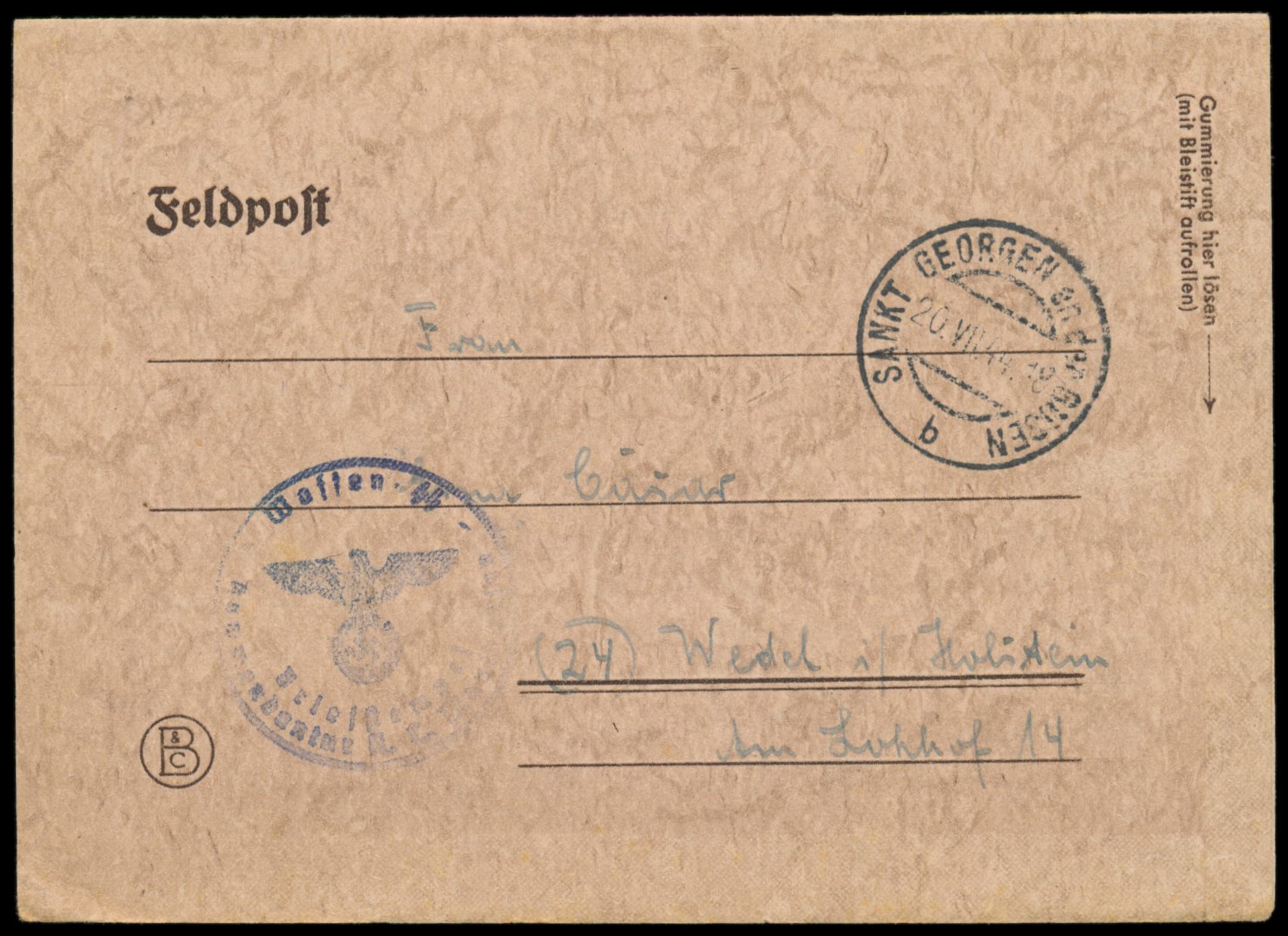 Feldpost-Faltbrief mit Stempel Sankt Georgen an der Gusen 20.7.44, Absender "... 1. Landesschützen z. b. V. 2. Zug, (12 b) Gusen ...", Briefstempel Waffen-SS / Kommandantur K. L. Mauthausen, nach Wedel (Holstein)