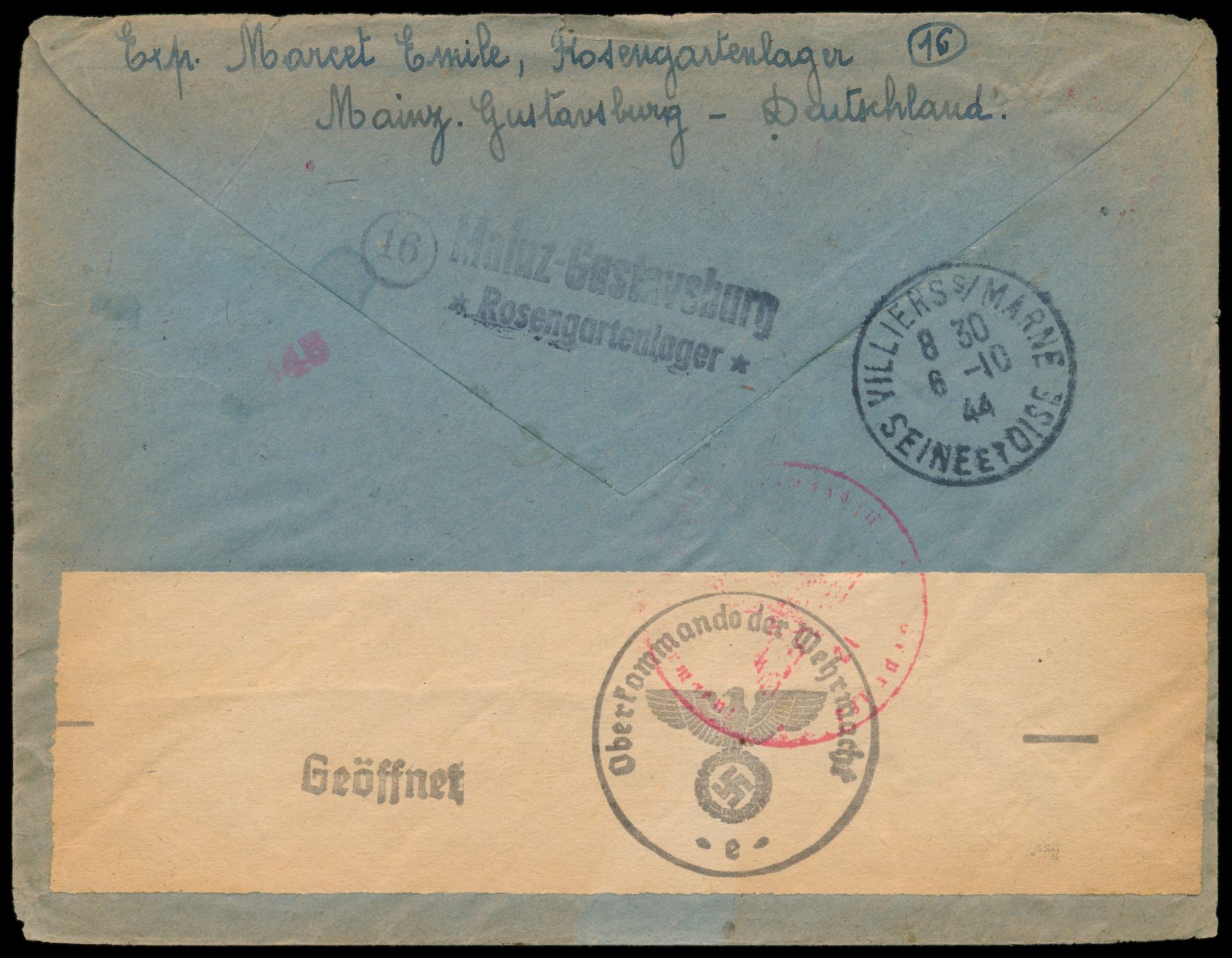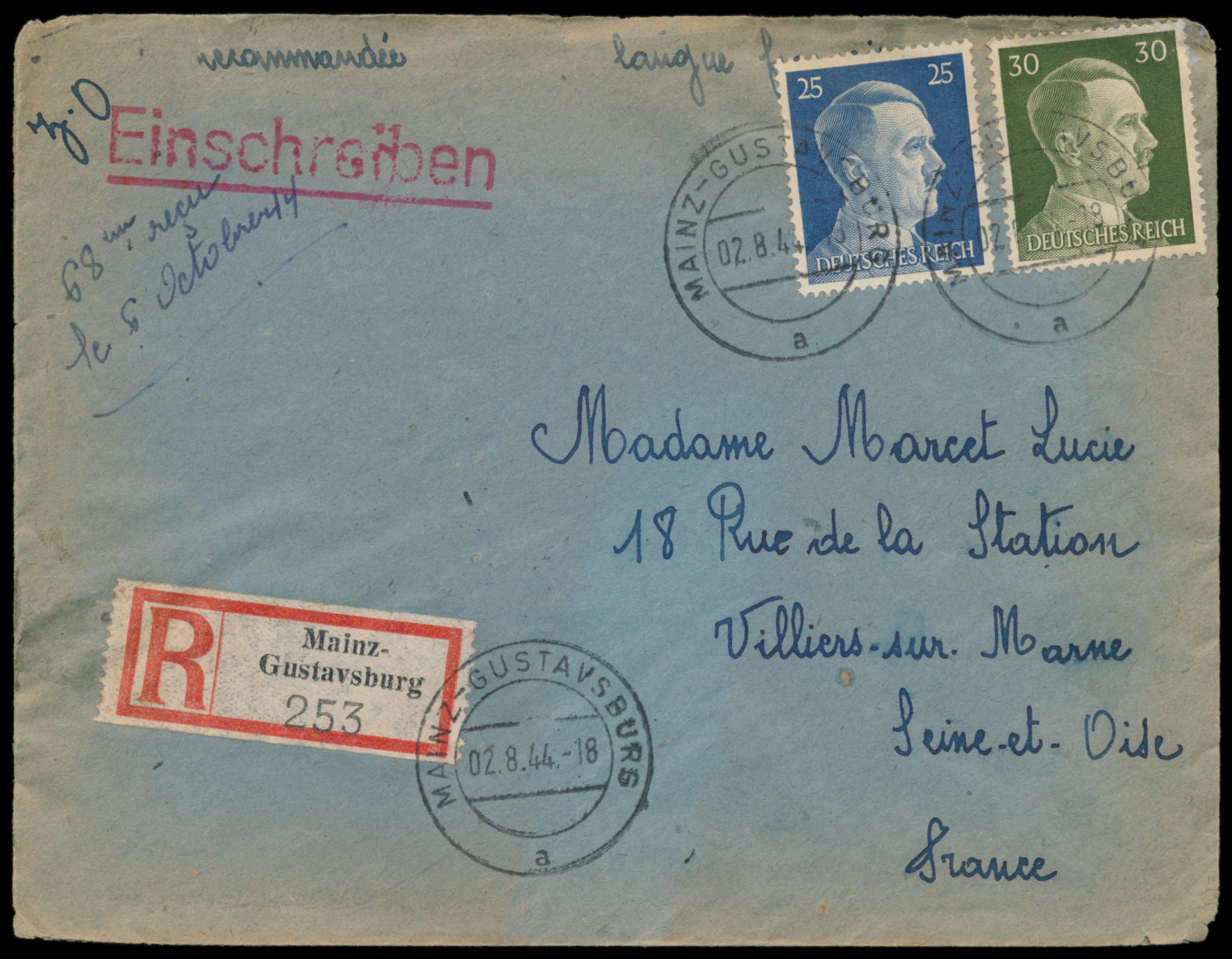 25 Pf. und 30 Pf. Hitler auf Einschreibbrief eines französischen Zwangsarbeiters des MAN-Werks in Gustavsburg nach Frankreich, Stempel Mainz-Gustavsburg 2.8.44, rückseitig Lagerstempel (16) Mainz-Gustavsburg / Rosengartenlager, Zensur Frankfurt, Ankunftstempel Villiers s. Marne 6.10.44, seltener später Beleg des Postverkehrs mit dem besetzten Frankreich, Umschlag ist am Rand schwach gebräunt