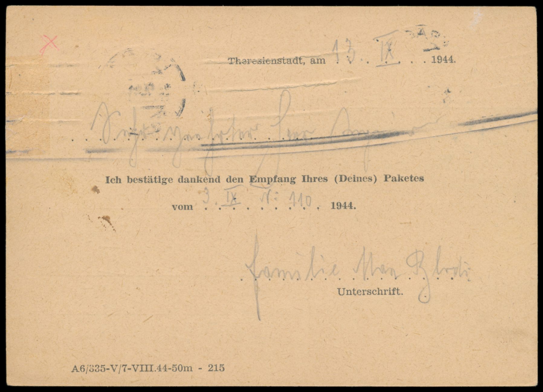Ghetto Theresienstadt, Empfangsbestätigungskarte für ein Paket, hellbrauner Karton, Druckvermerk "A 6/335-V/7-VIII.44-50m - 215", Frankatur Böhmen-Mähren 2 x 30 h, Maschinenstempel Prag 2 27.9.44