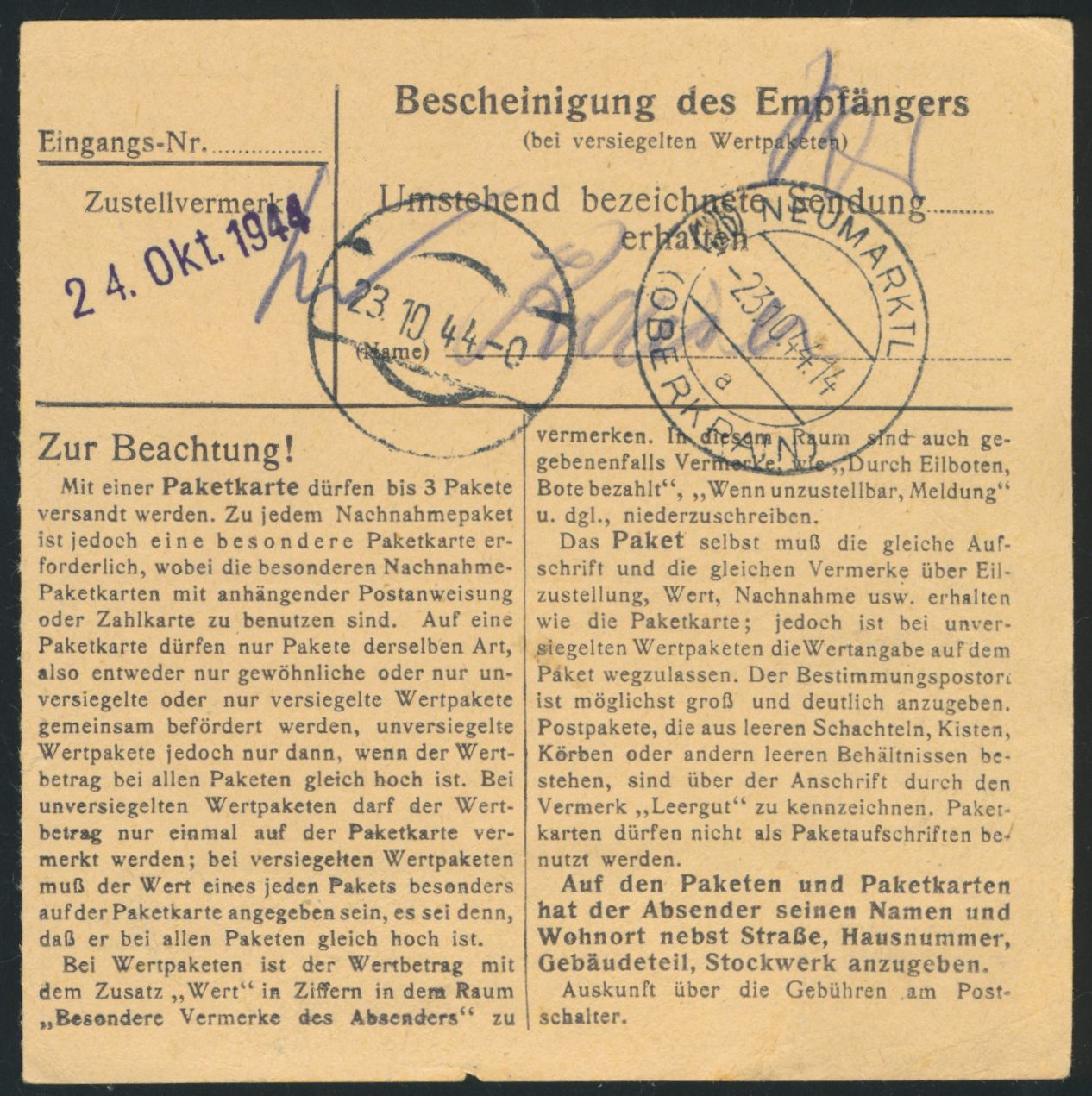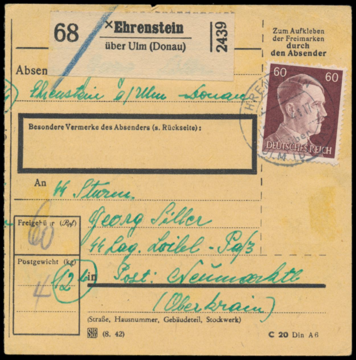 Einzelfrankatur 60 Pf. Hitler auf Paketkarte mit Stempel Ehrenstein über Ulm (Donau) 12.10.44 an einen SS-Mann des SS-Lagers Loibl-Pass, Angehöriger der Bewachungsmannschaft, Ankunftstempel Neumarktl (Oberkrain) und stummer Stempel 23.10.44, zugestellt am 24.10.44