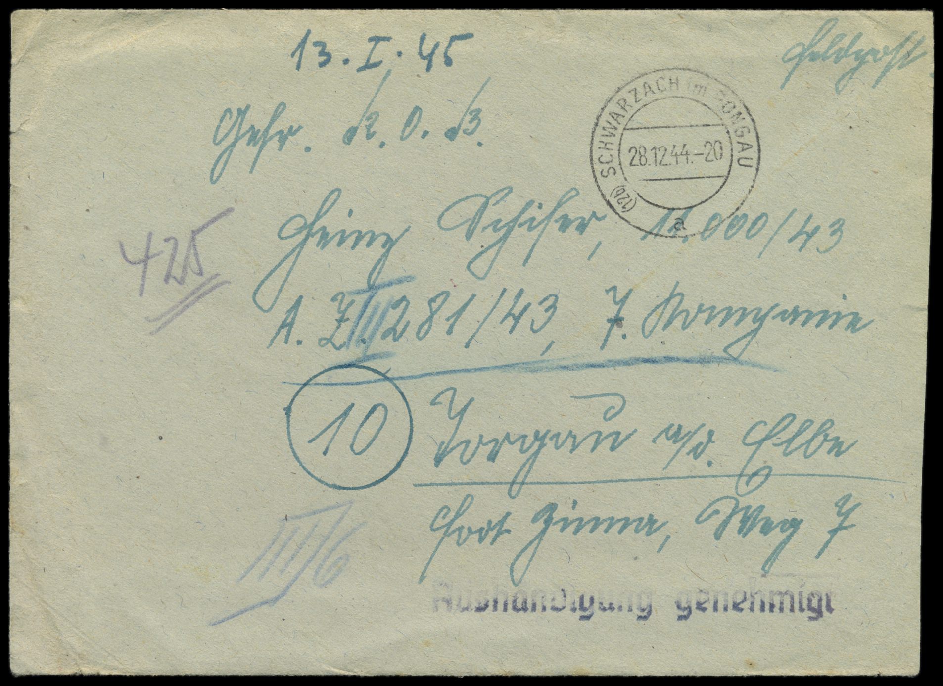 Feldpostbrief Schwarzach im Pongau 28.12.44 in das Wehrmachtsgefängnis Torgau Fort Zinna, Z1 Aushändigung genehmigt, mit Inhalt, Rückseite roter Stempel Reichskriegsgericht, Datum 6.1.45, Zensurvermerk