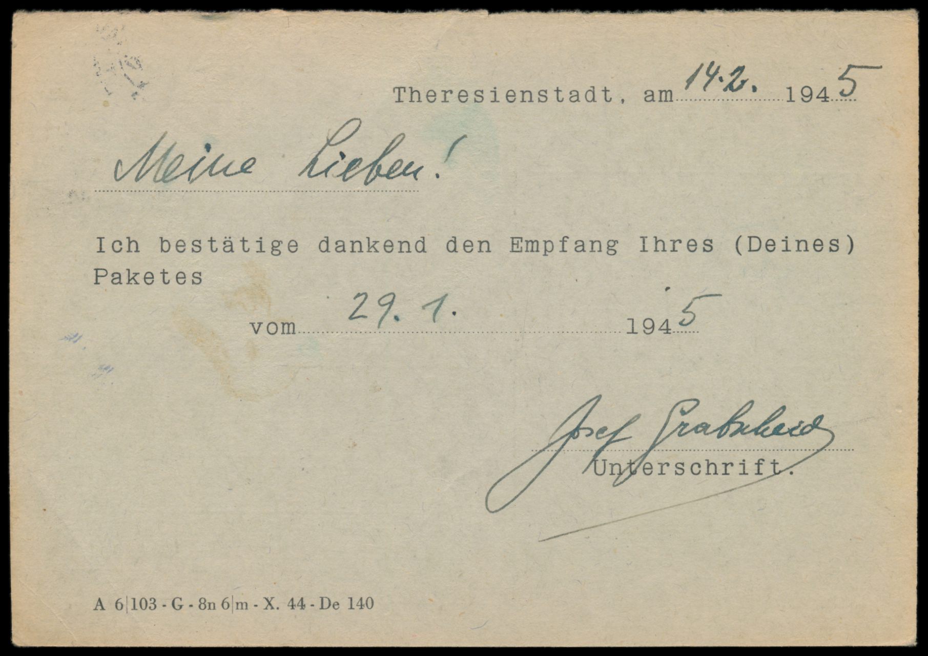 Ghetto Theresienstadt, Empfangsbestätigungskarte für ein Paket, grüner Karton, Druckvermerk "A 6/103 - G-8n 6/m - X. 44 - De 140", Frankatur Böhmen-Mähren 60 h, Stempel Prag 2 16.3.45, spätes Datum, nach Prossnitz