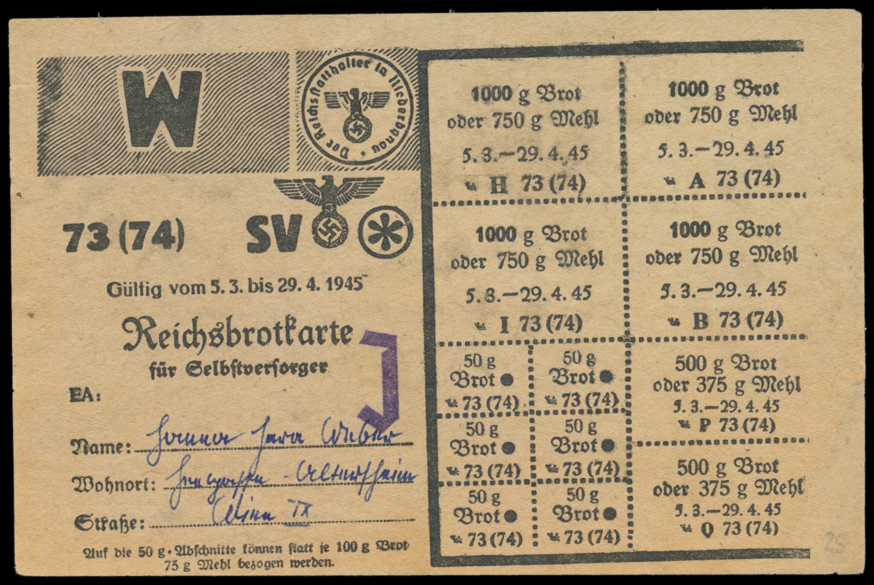 Reichsbrotkarte von Wien / Niederdonau für Selbstversorger mit aufgestempeltem "J" , gültig vom 5.3. bis 29.4.1945, auf Wasserzeichen-Papier (Waben), ausgestellt für Hanna "Sara" Weber, seltenes Dokument