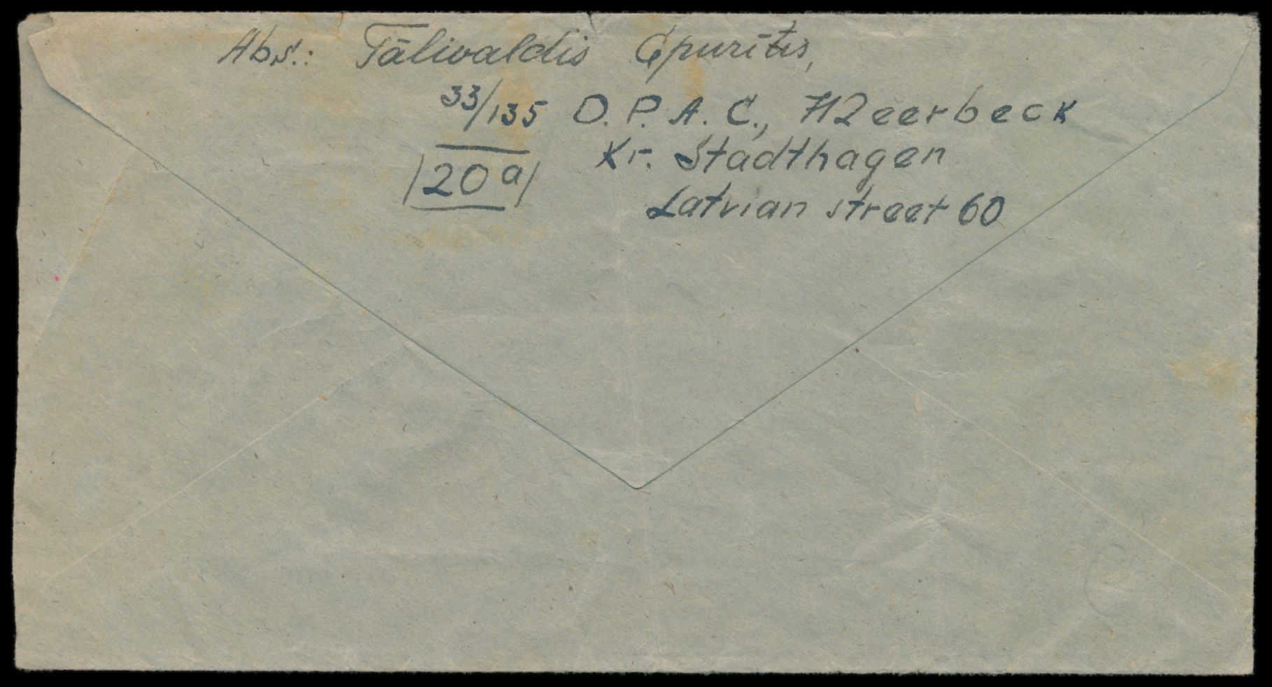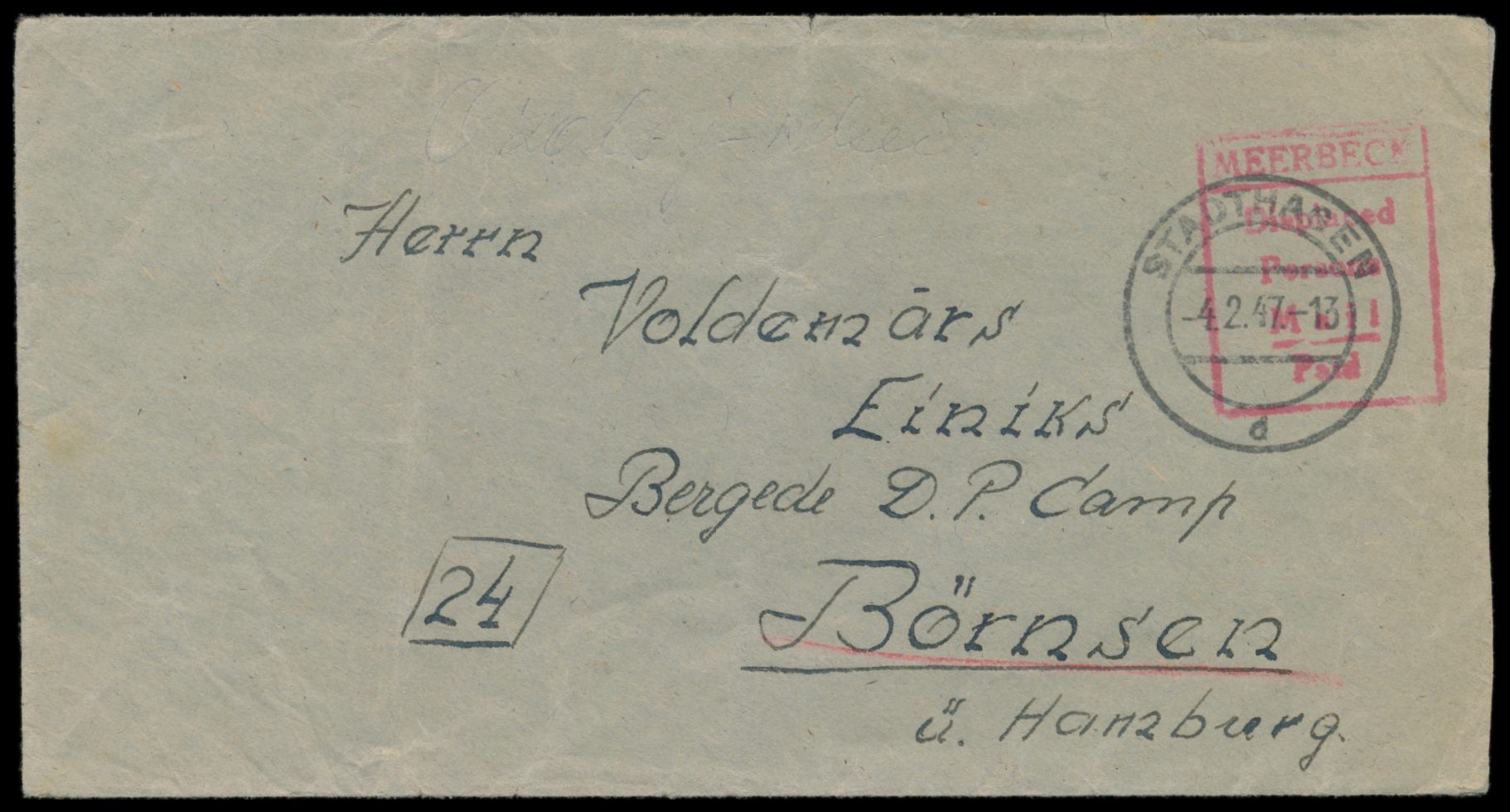Brief eines Letten im DP-Camp Meerbeck mit Stempel Meerbeck / Displaced / Persons / Mail / Paid und Stempel Stadthagen 4.2.47 an einen Letten im DP-Camp Börnsen, Umschlag hat zwei schwache senkrechte Büge, Bedarf