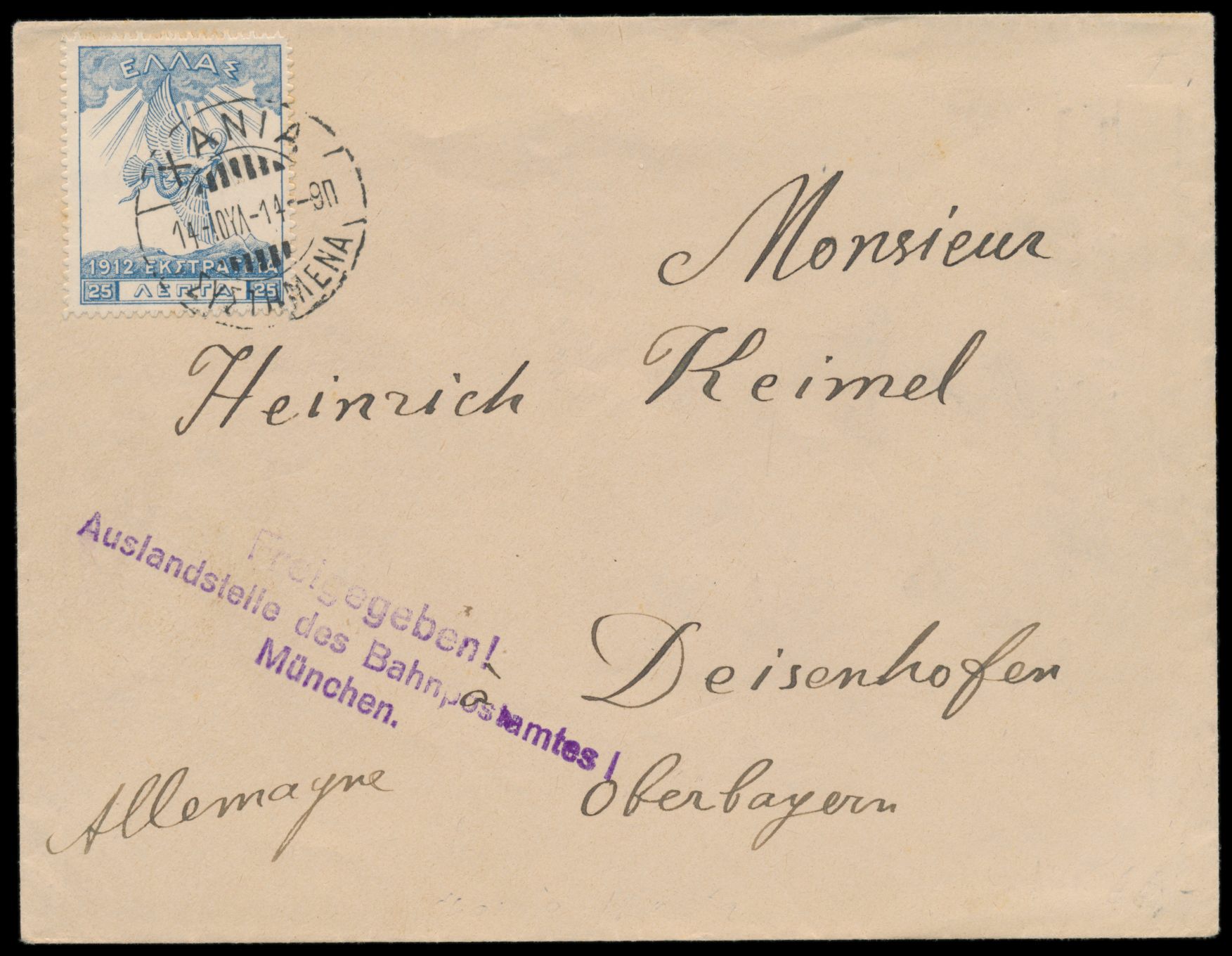 Neugriechenland 25 L. auf Brief mit Stempel Xania 14.7.14 (27.7.1914) nach Deutschland, seltener violetter L3 Freigegeben! / Auslandstelle des Bahnpostamtes I / München , für bei Kriegsausbruch eingelangte Post aus dem Ausland, Riemer Nr. 1