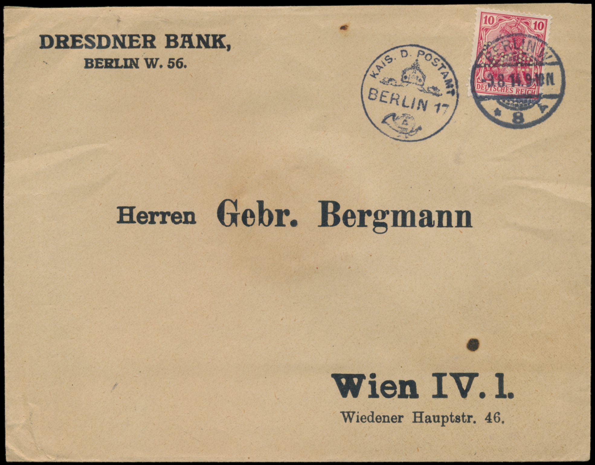 10 Pf. mit Firmenlochung "Dr.B." auf Brief nach Wien, Stempel Berlin W 8 3.8.14, Postamt-Dienstsiegel Kais. D. Postamt Berlin 17 als Zensurstempel für Geschäftspost, Riemer Nr. 1