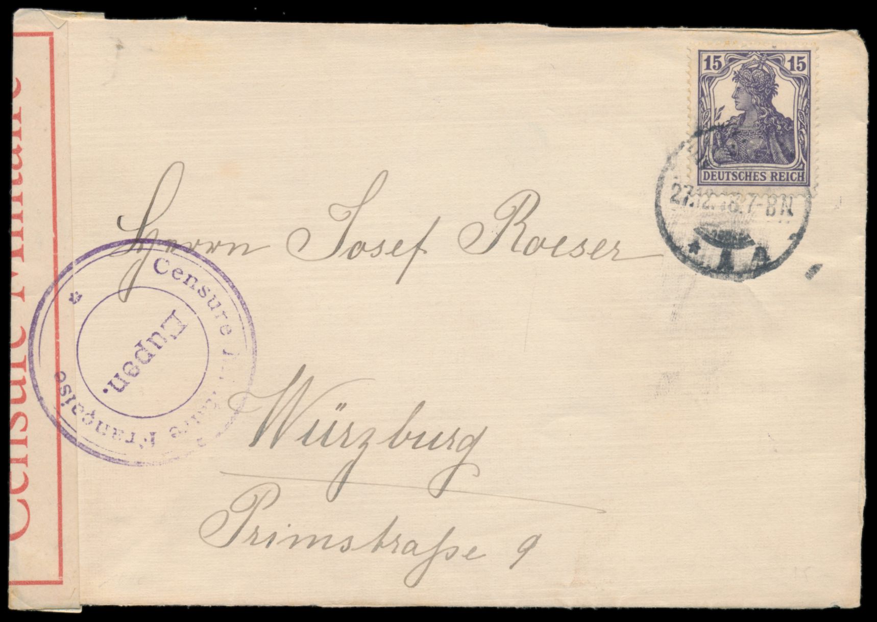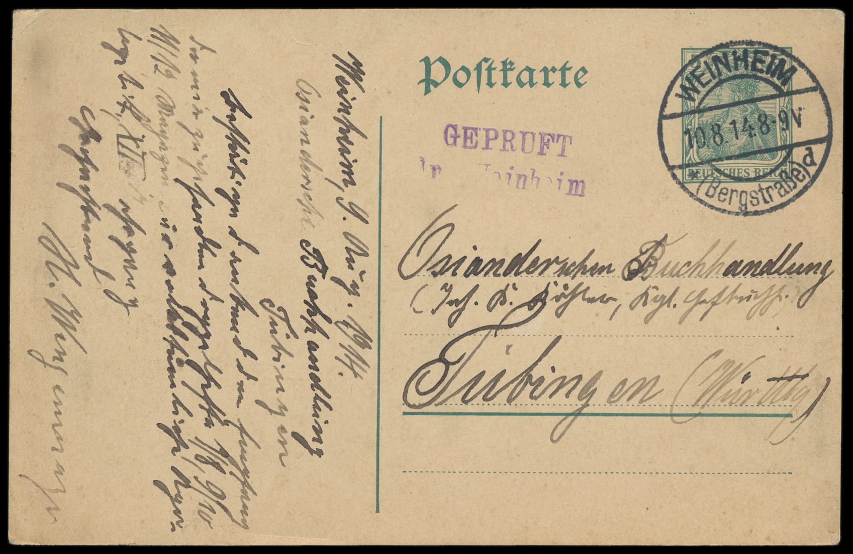 Ganzsache 5 Pf. mit Stempel Weinheim (Bergstraße) 10.8.14 nach Tübingen, violetter Setzkasten-Z2 GEPRUFT / In Weinheim, seltener lokaler Zensurstempel bei Kriegsbeginn, im Riemer nicht aufgeführt