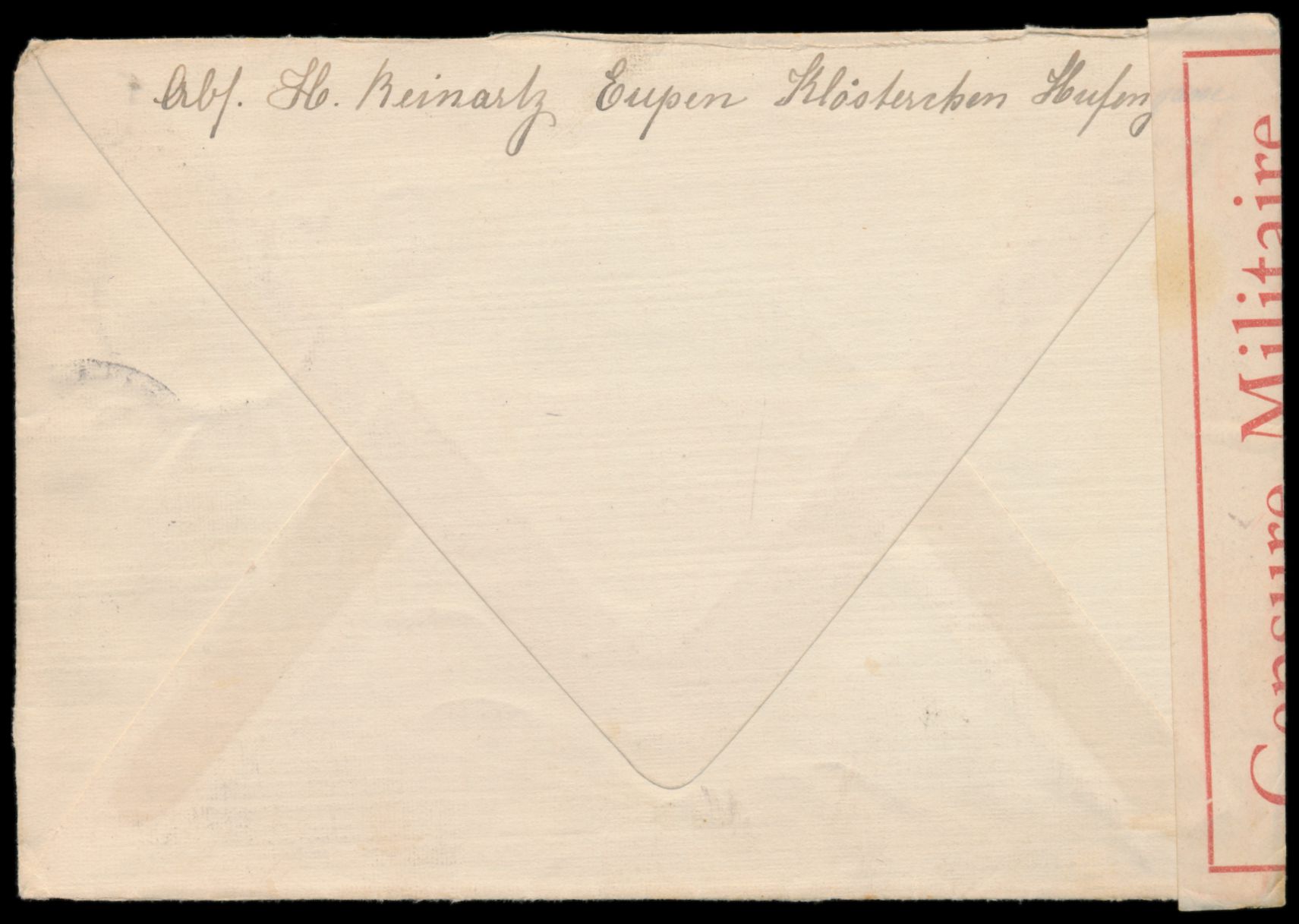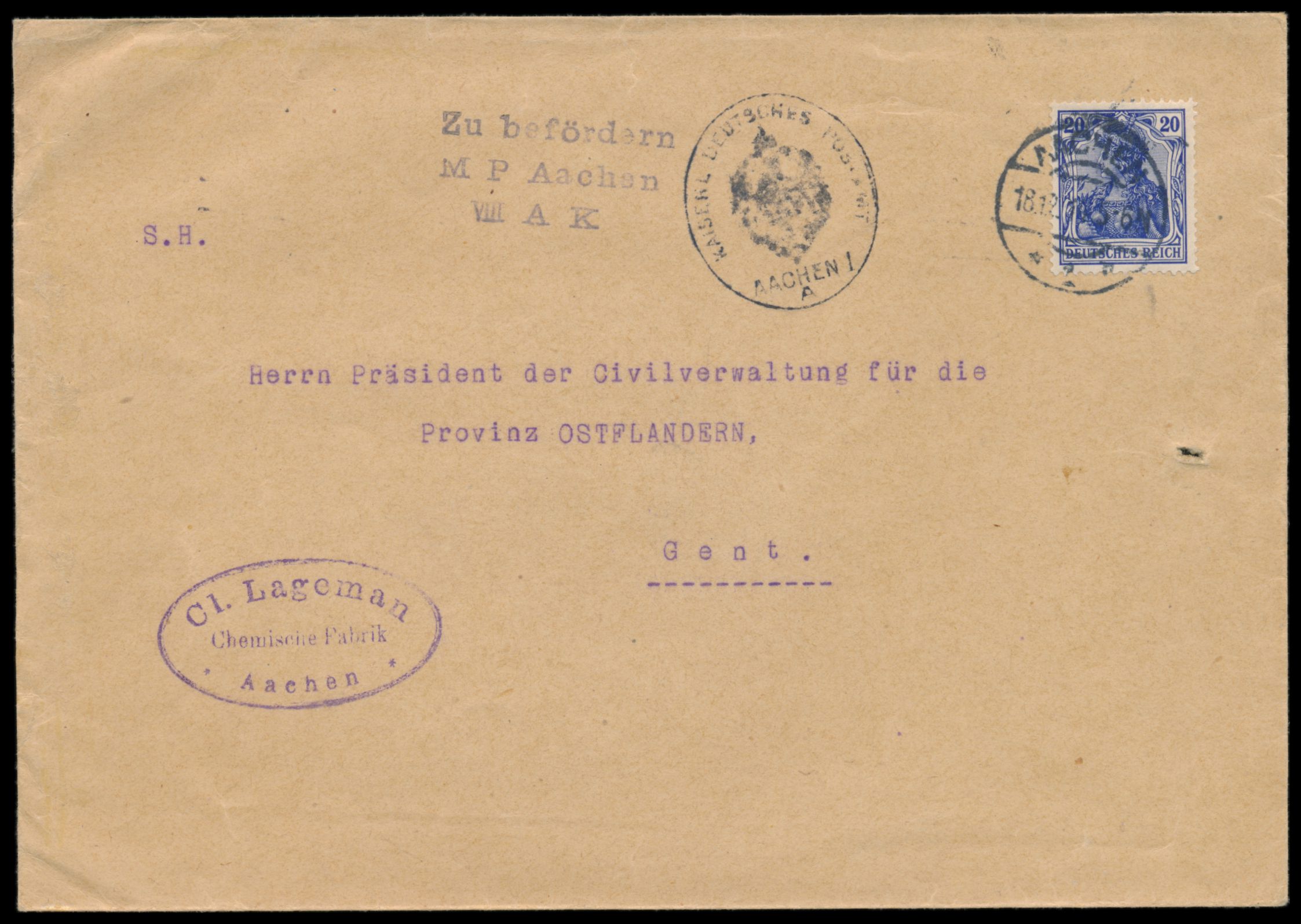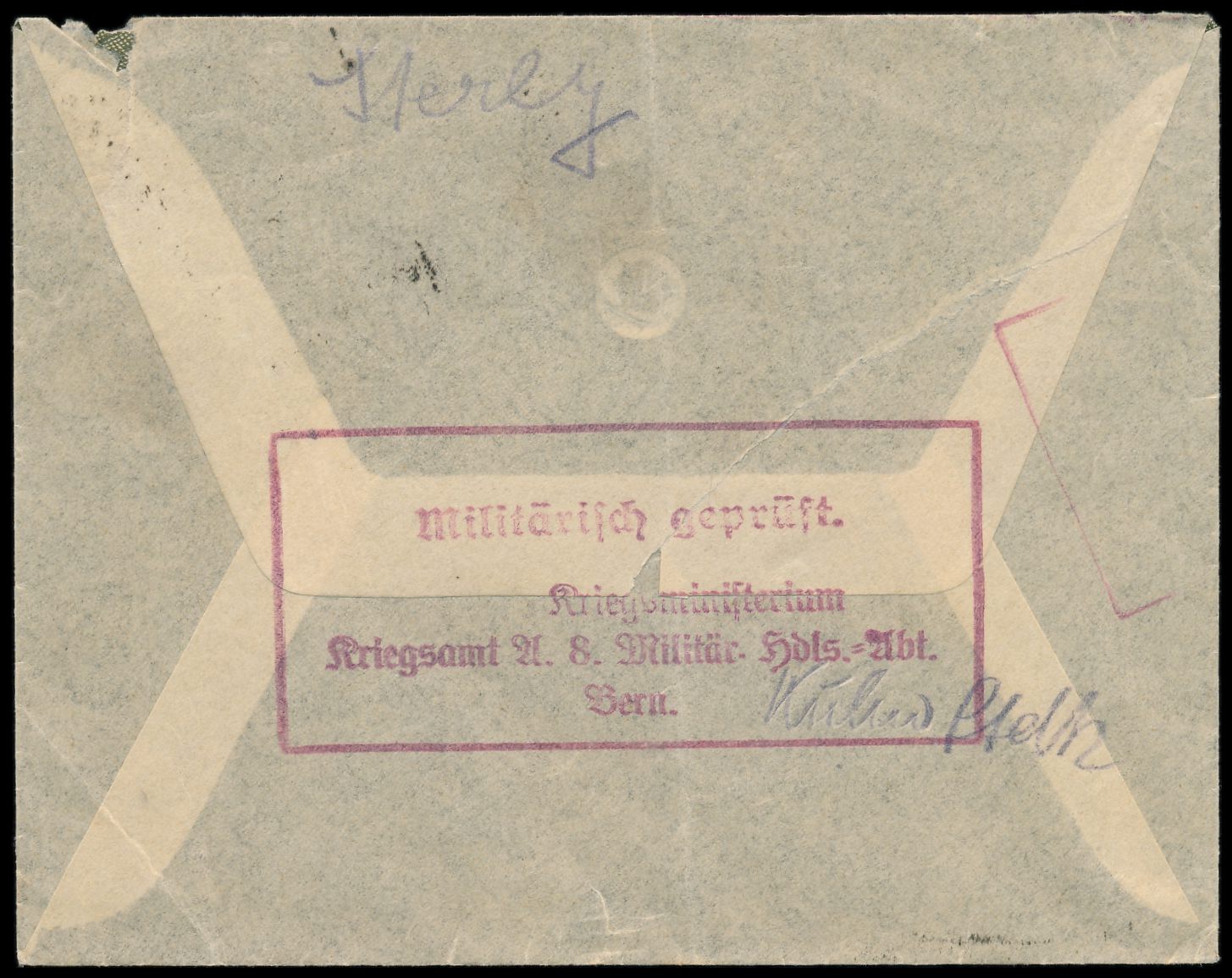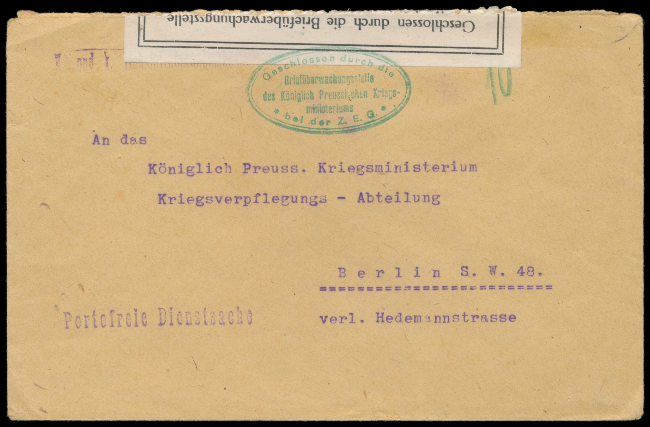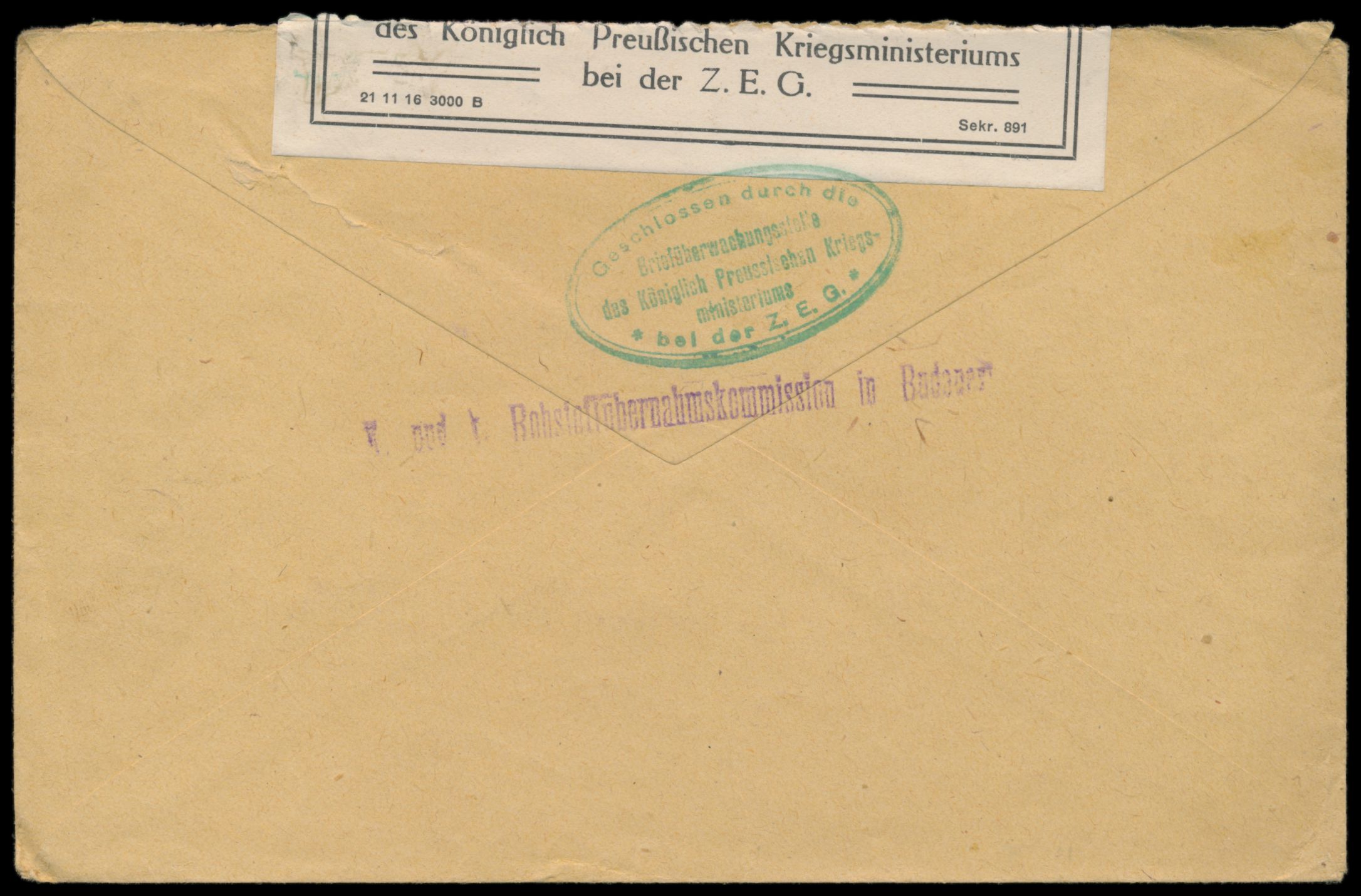 seltener grüner Zensur-Ovalstempel "Geschlossen durch die Briefüberwachungsstelle des Königlich Preussischen Kriegsministeriums bei der Z.E.G." beidseitig auf weißem Verschlußzettel mit gleichlautendem Text auf Briefumschlag der K. u. k. Rohstoffübernahmekommission in Budapest nach Berlin
