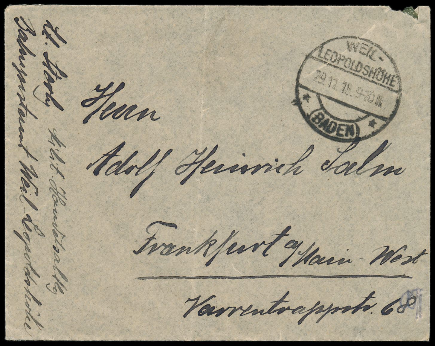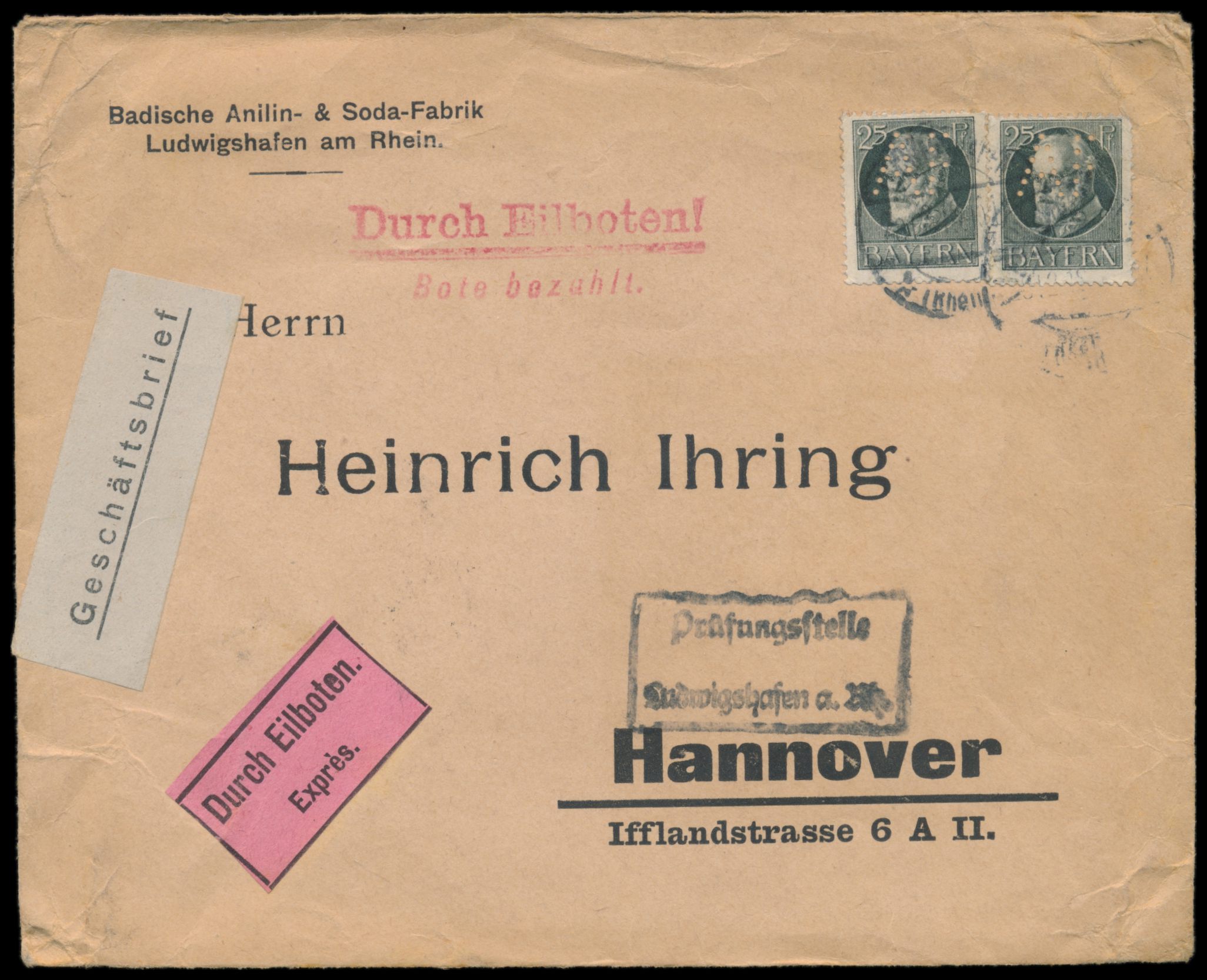 Rheinland-Besetzung, 2 x Bayern 25 Pf. mit Firmenlochung "A F" (1 x kleiner Eckfehler) auf unverschlossenem Eilbrief, Aufkleber "Geschäftsbrief", Stempel Ludwigshafen (Rhein) 30.12.18, seltener R2 Prüfungsstelle / Ludwigshafen a. Rh. ("des II. Armee-Korps" aptiert), nach Hannover, Ankunftstempel 1.1.1919
