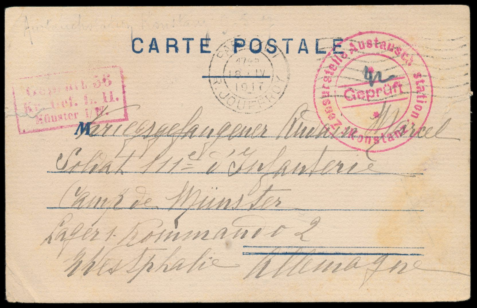großer roter Zweikreisstempel Zensurstelle Austausch-Station Konstanz / Geprüft, im Riemer nicht aufgeführte Type, auf Kriegsgefangenen-Postkarte mit Maschinenstempel Paris 18.4.1917 an einen Franzosen im Kriegsgefangenenlager Münster mit Lager-Zensurstempel, Karte ist gering fleckig
