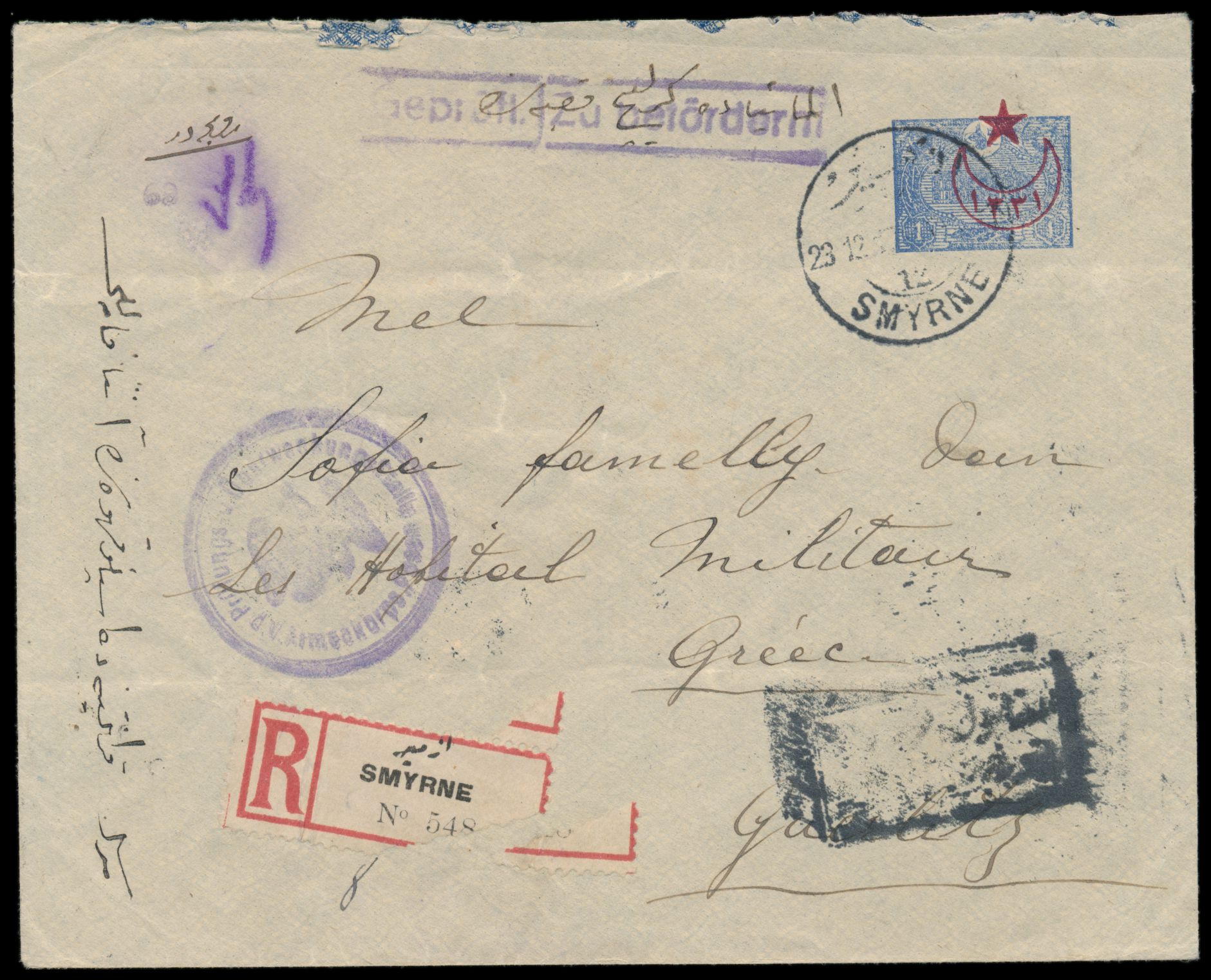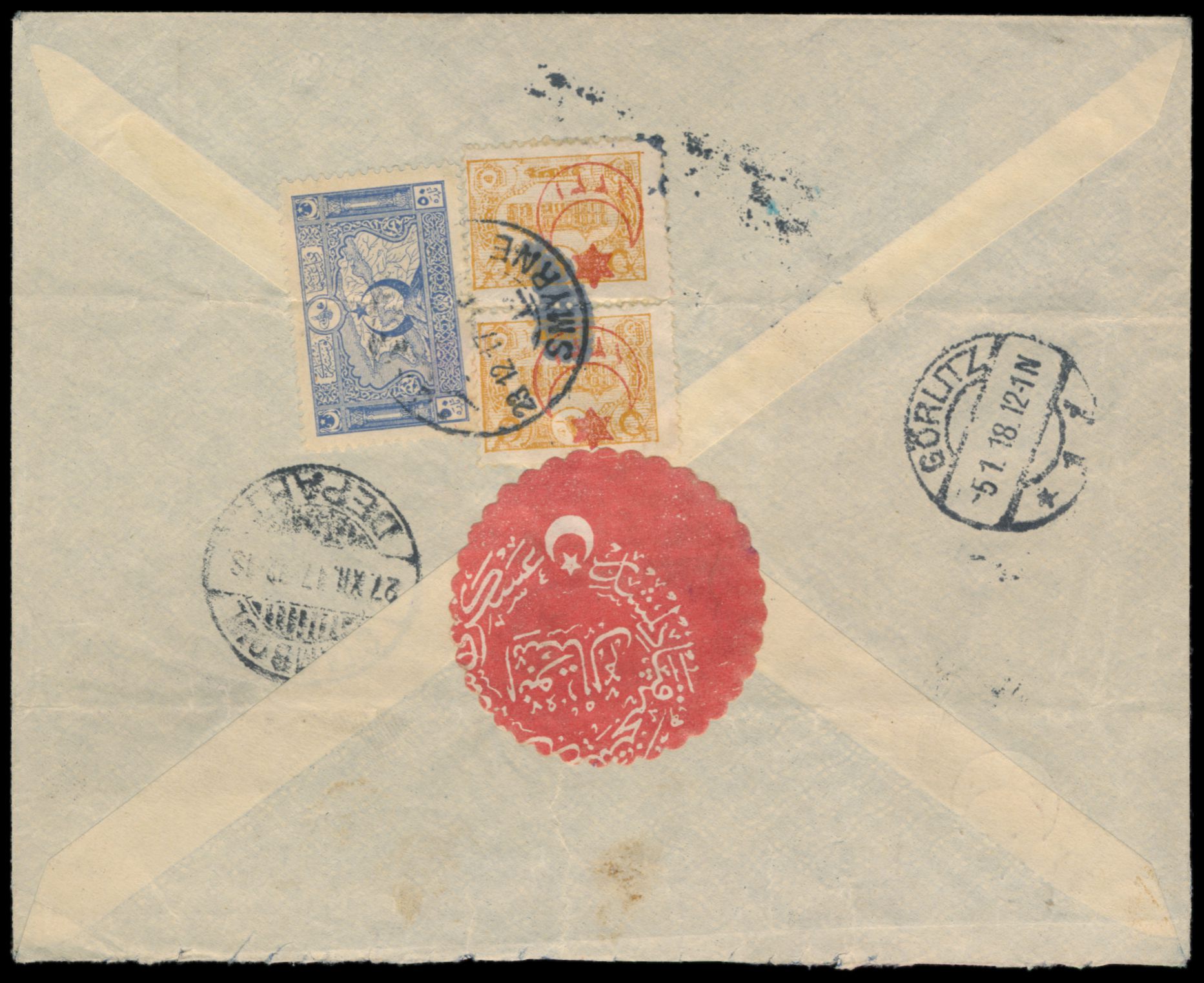 Türkei-Ganzsachenumschlag 1 Pia. mit rückseitig 1 Pia. und 2 x 5 Para (Kriegssteuer) als Einschreiben mit Stempel Smyrne 23.12.17 an einen Griechen im Militär-Hospital in Görlitz (Internierung des IV. Griechischen Armeekorps in Görlitz), türkische Zensur und deutsche Zensur der Zensurstelle Posen (Zweigstelle Görlitz) , Riemer Nr. 1 und 3 (= LP), Ankunftstempel Görlitz 5.1.18, zwei schwache waagerechte Büge, Bedarf