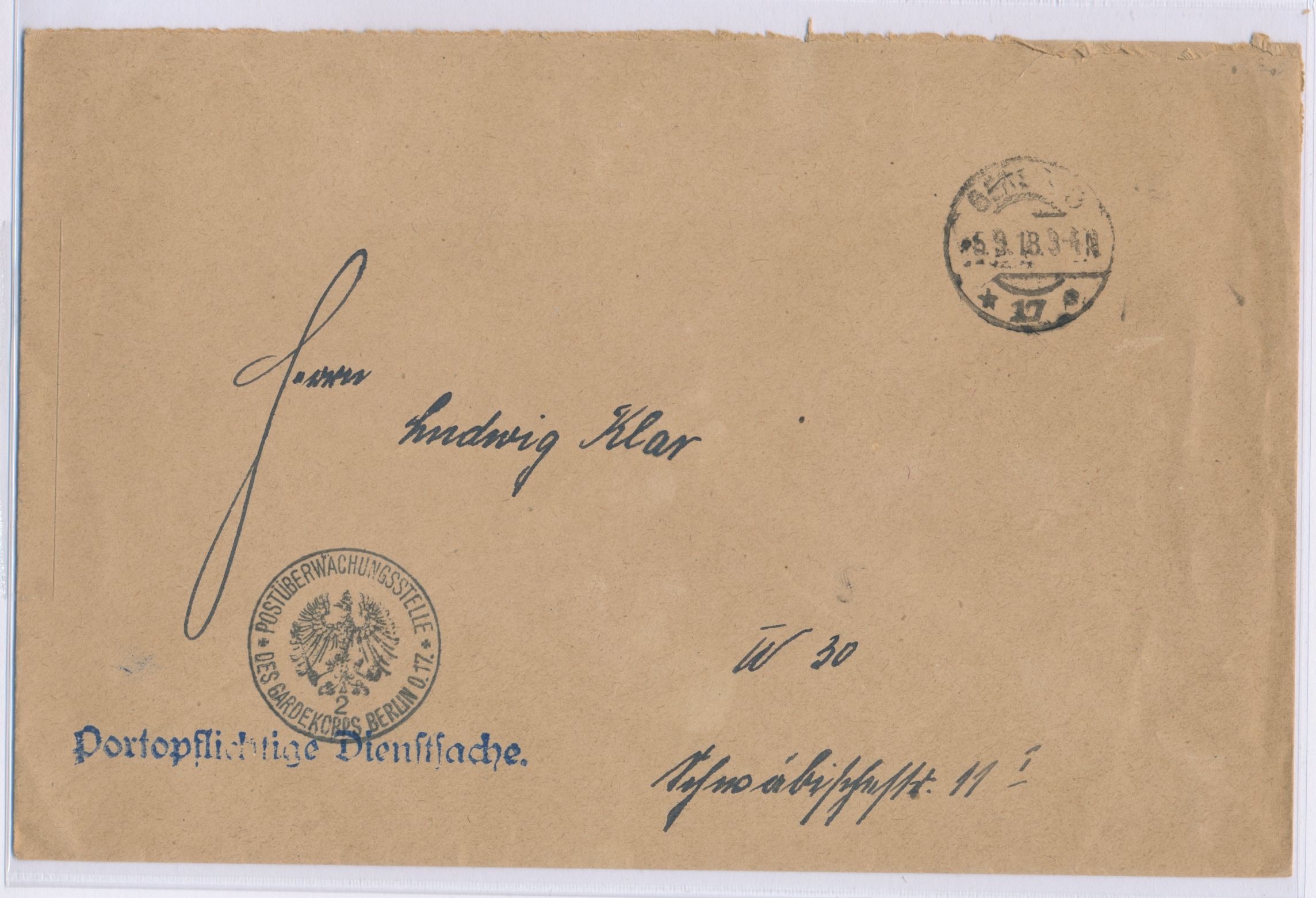 Orts-Dienstbrief "Portopflichtige Dienstsache" mit Stempel Berlin O. 17 5.9.18, Dienstsiegel Postüberwachungsstelle des Gardekorps Berlin O.17.